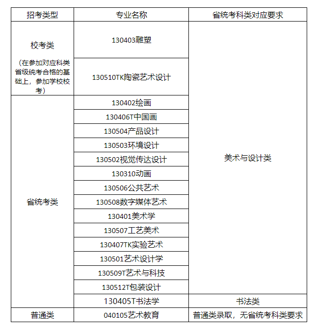 景德镇陶瓷大学关于2026年艺术类本科招生专业省统考科类对应要求