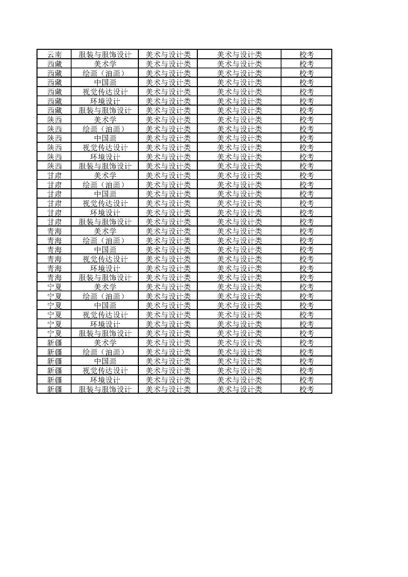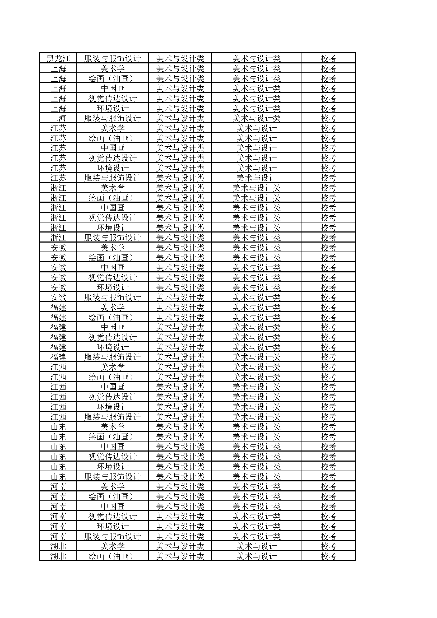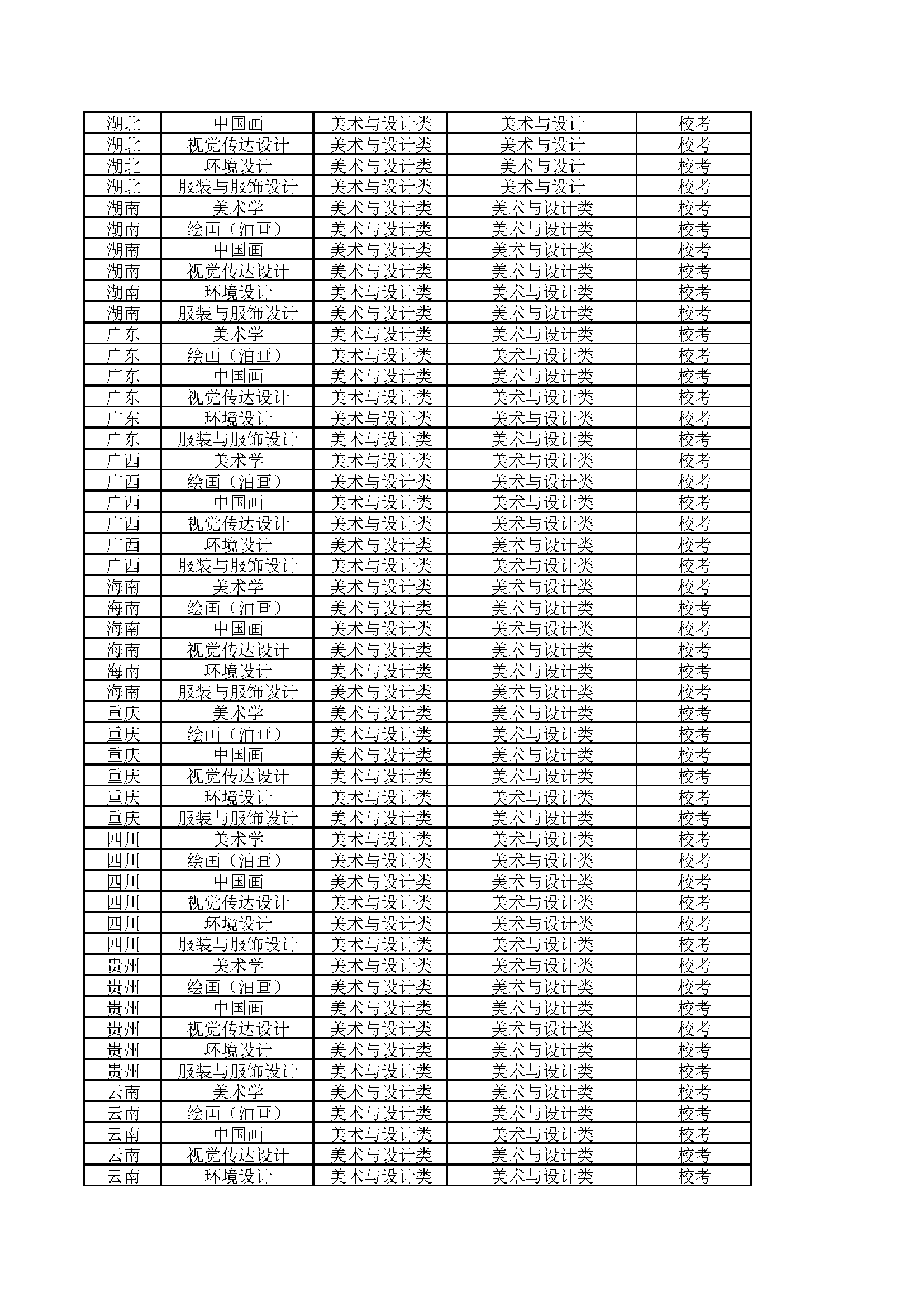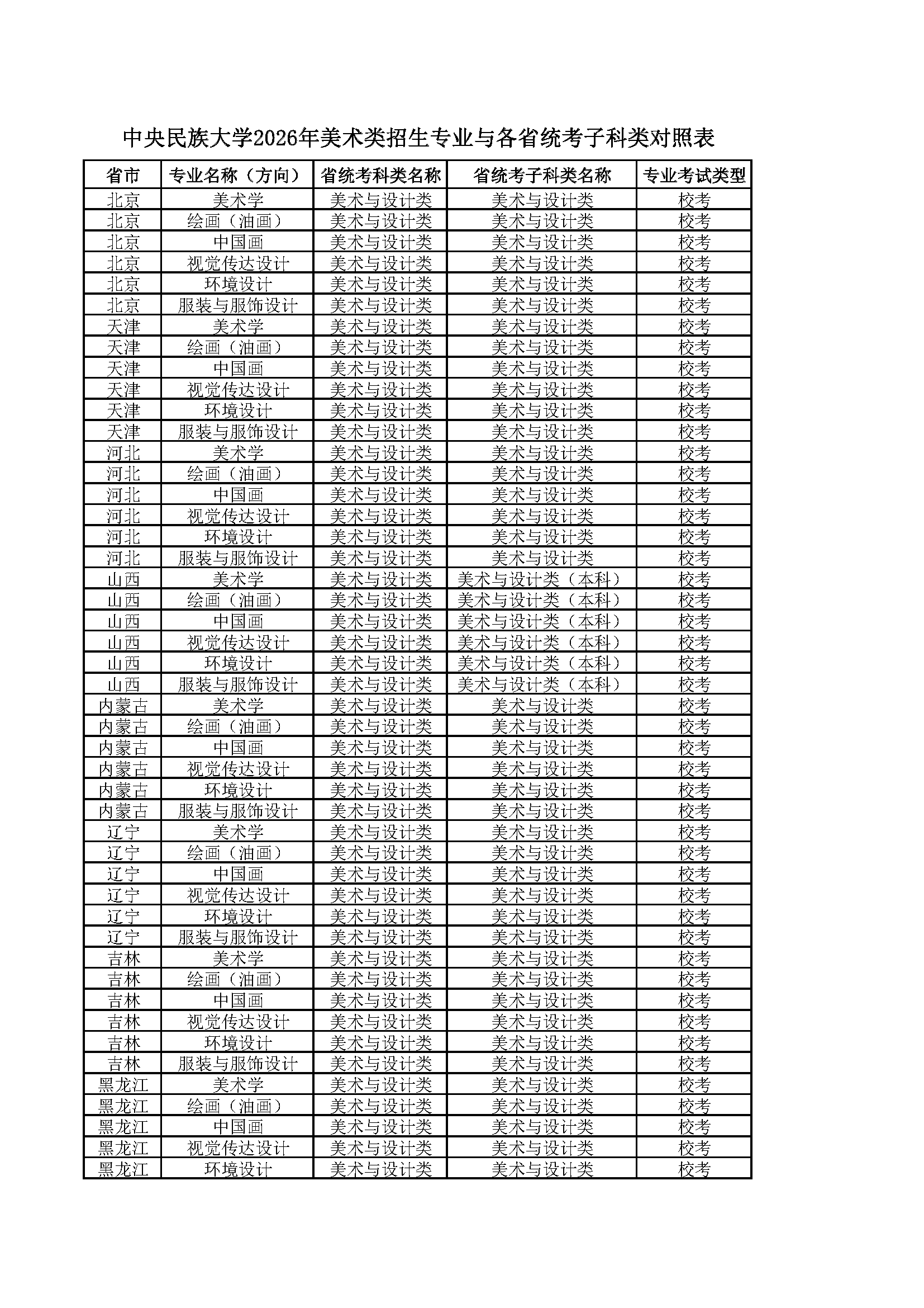 中央民族大学2026年美术类本科招生校考专业与各省统考子科类对照表