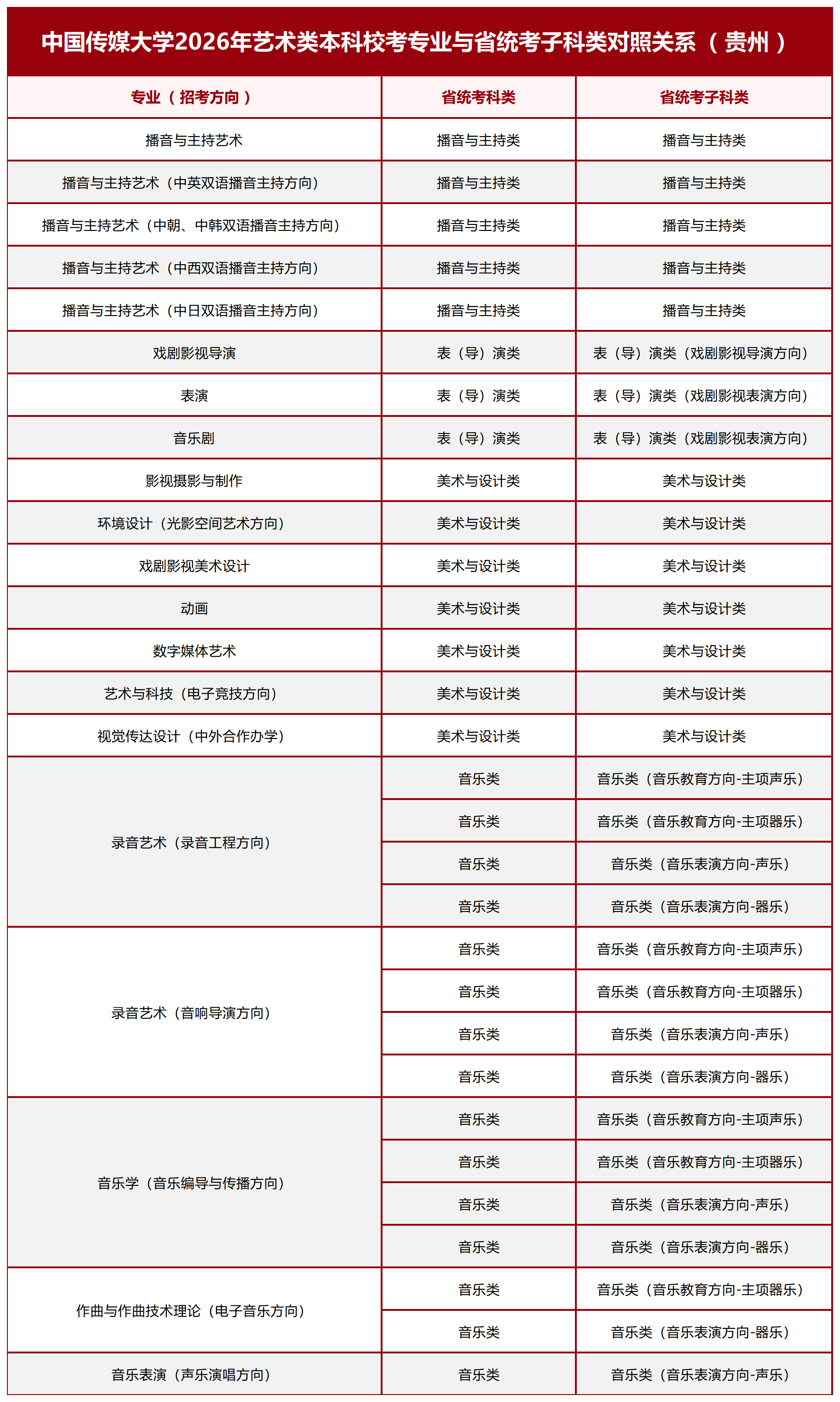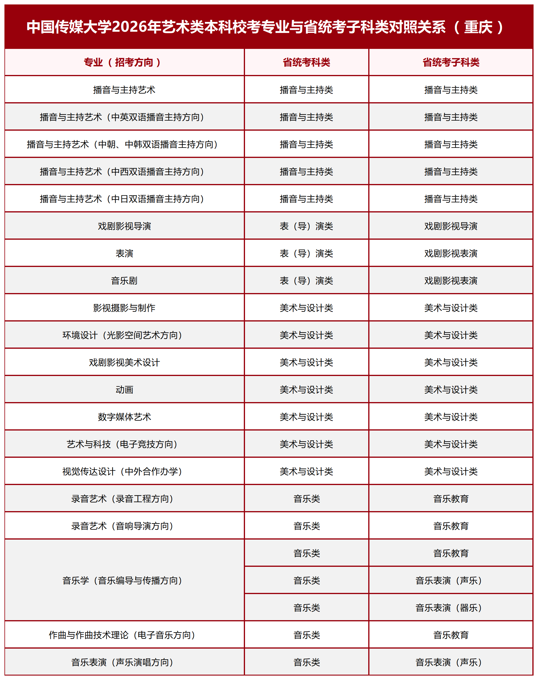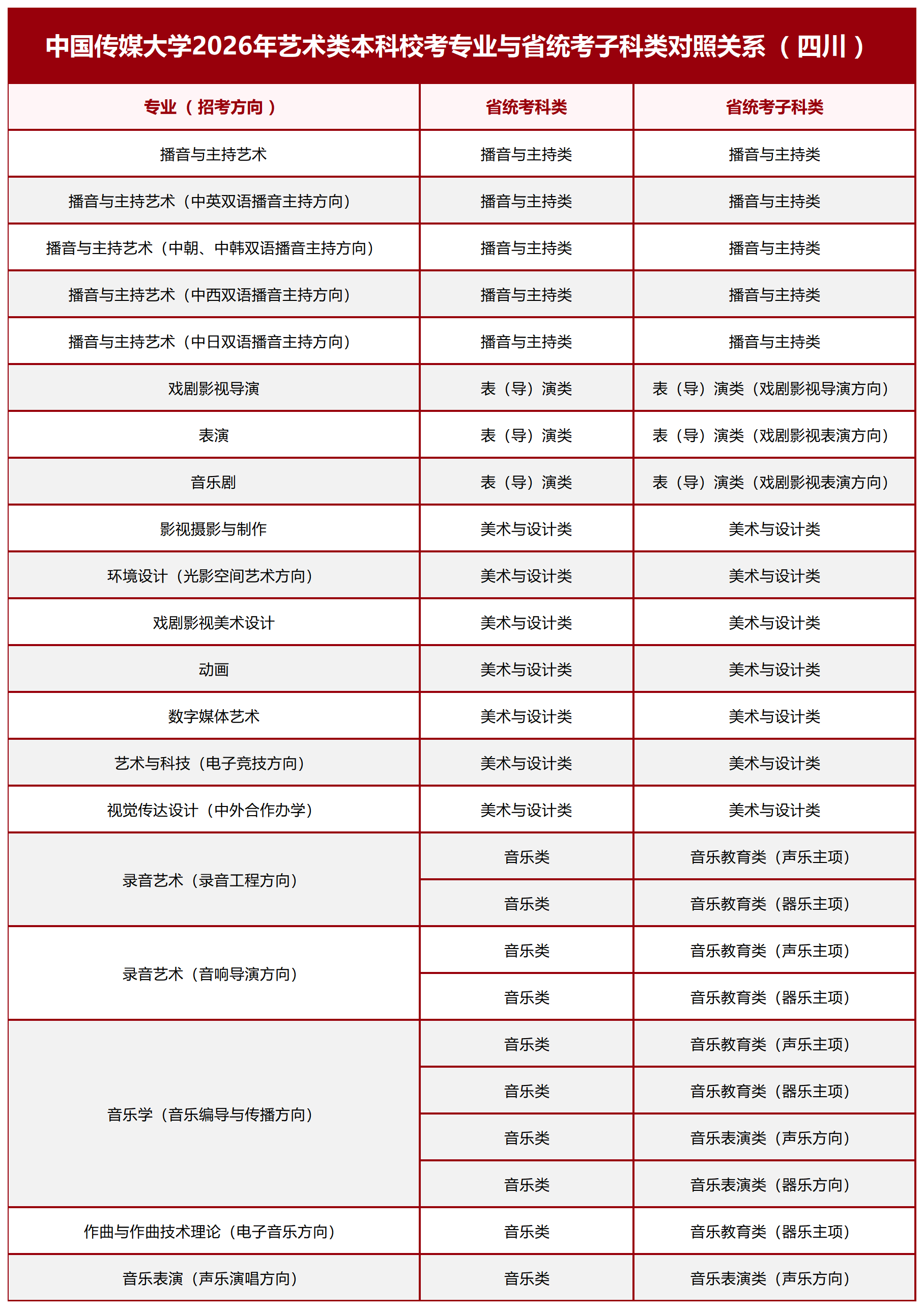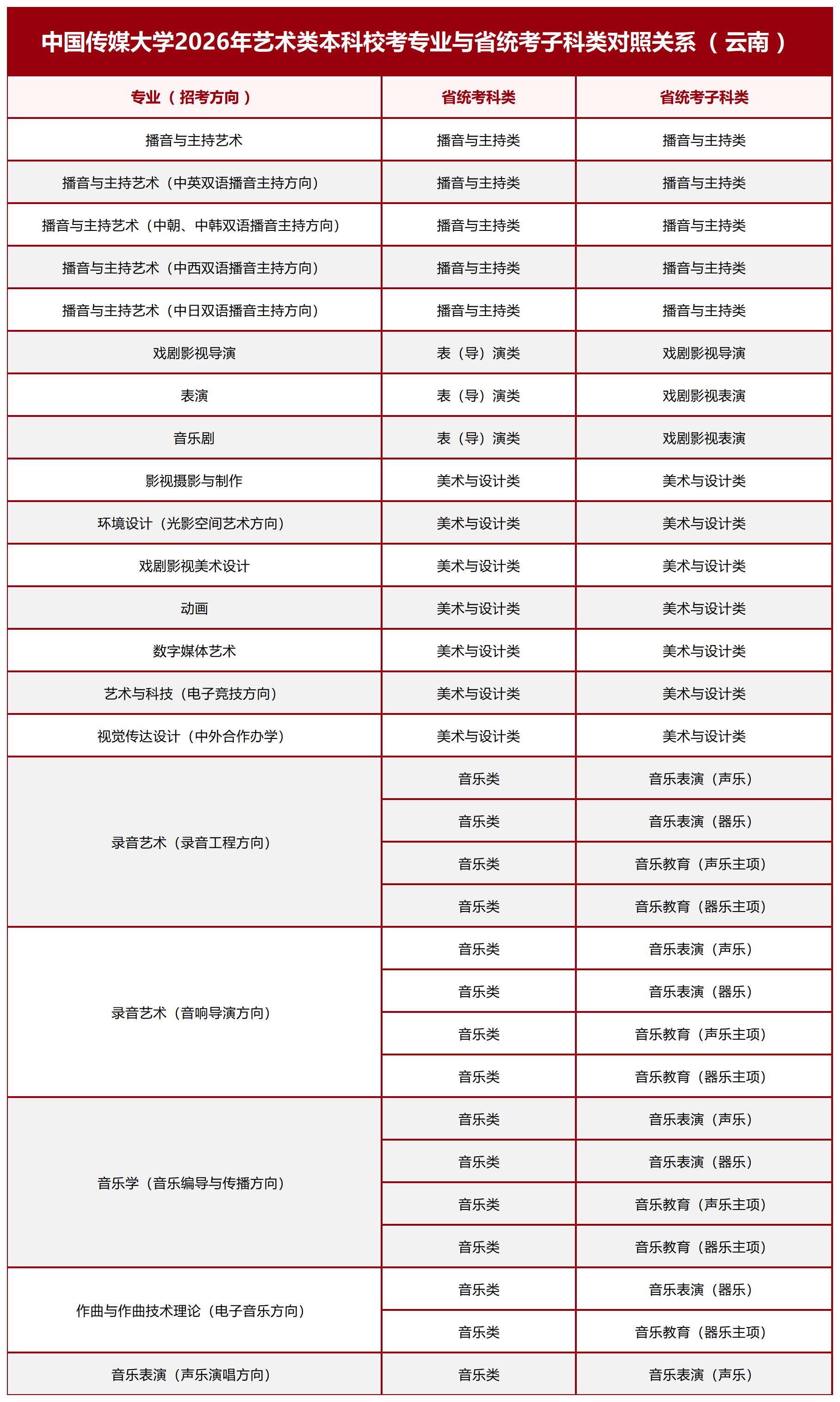 中国传媒大学2026年艺术类本科校考专业与省统考子科类对照关系(西南地区)