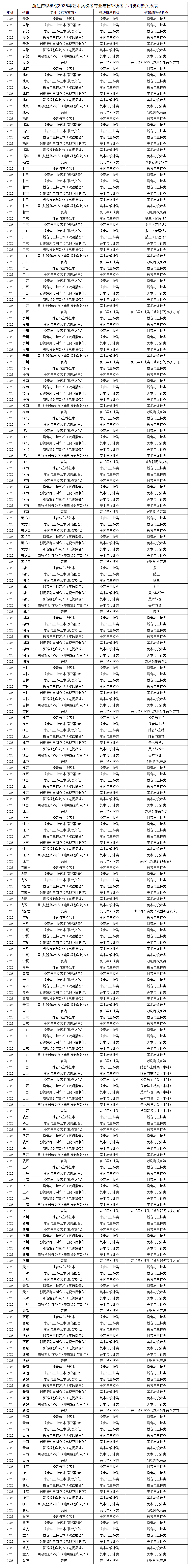 浙江传媒学院2026年艺术类校考专业与省级统考子科类对照关系表