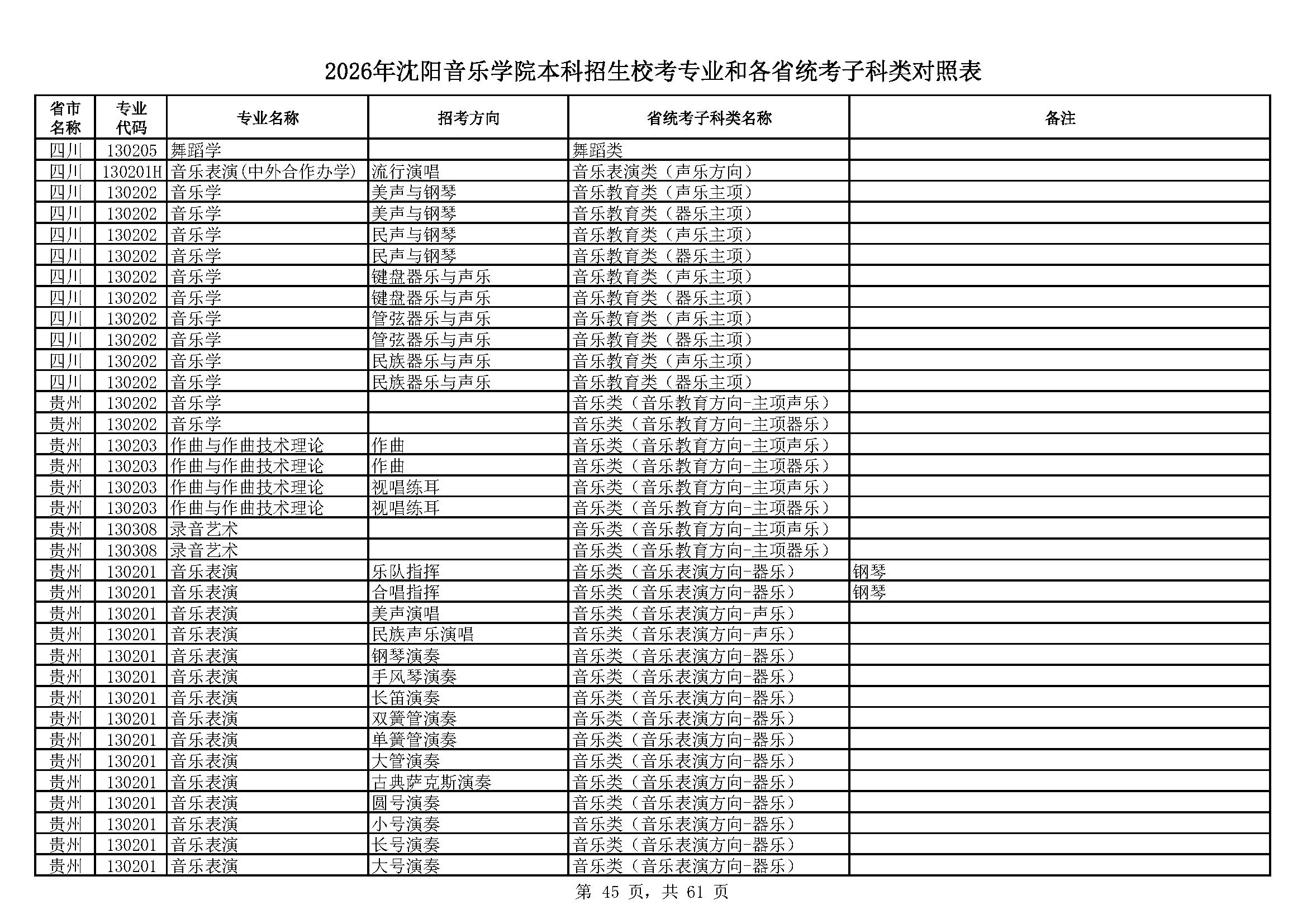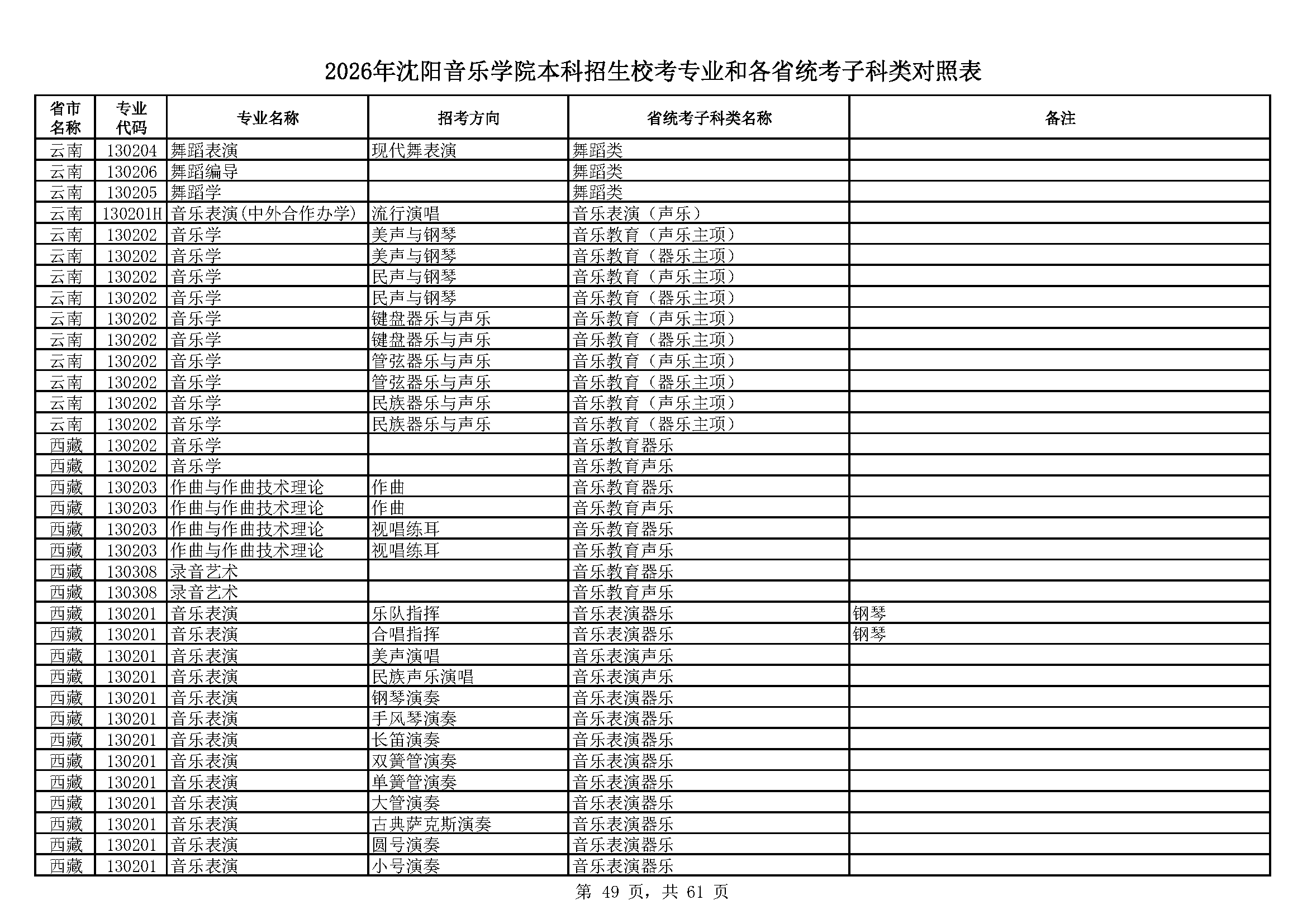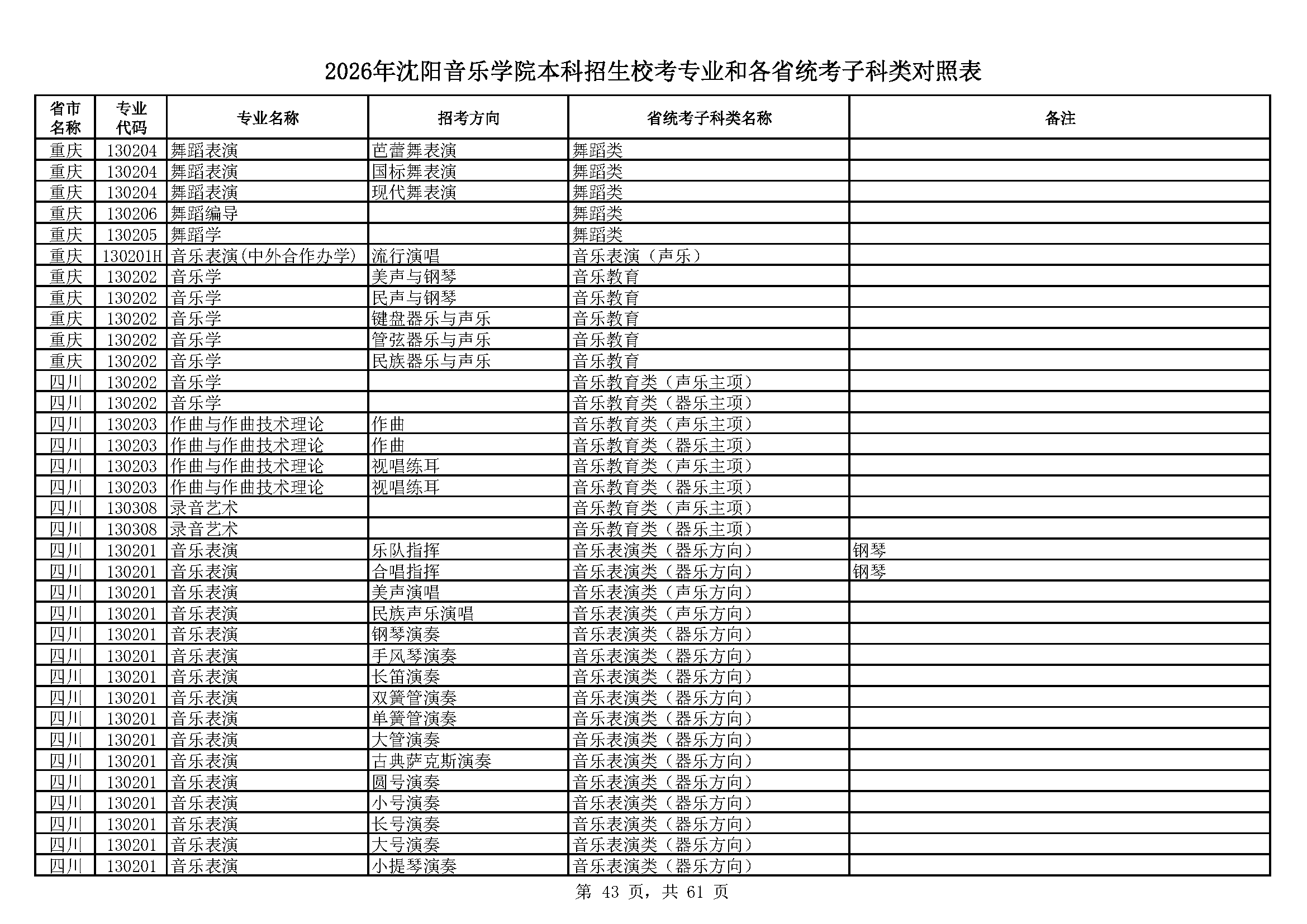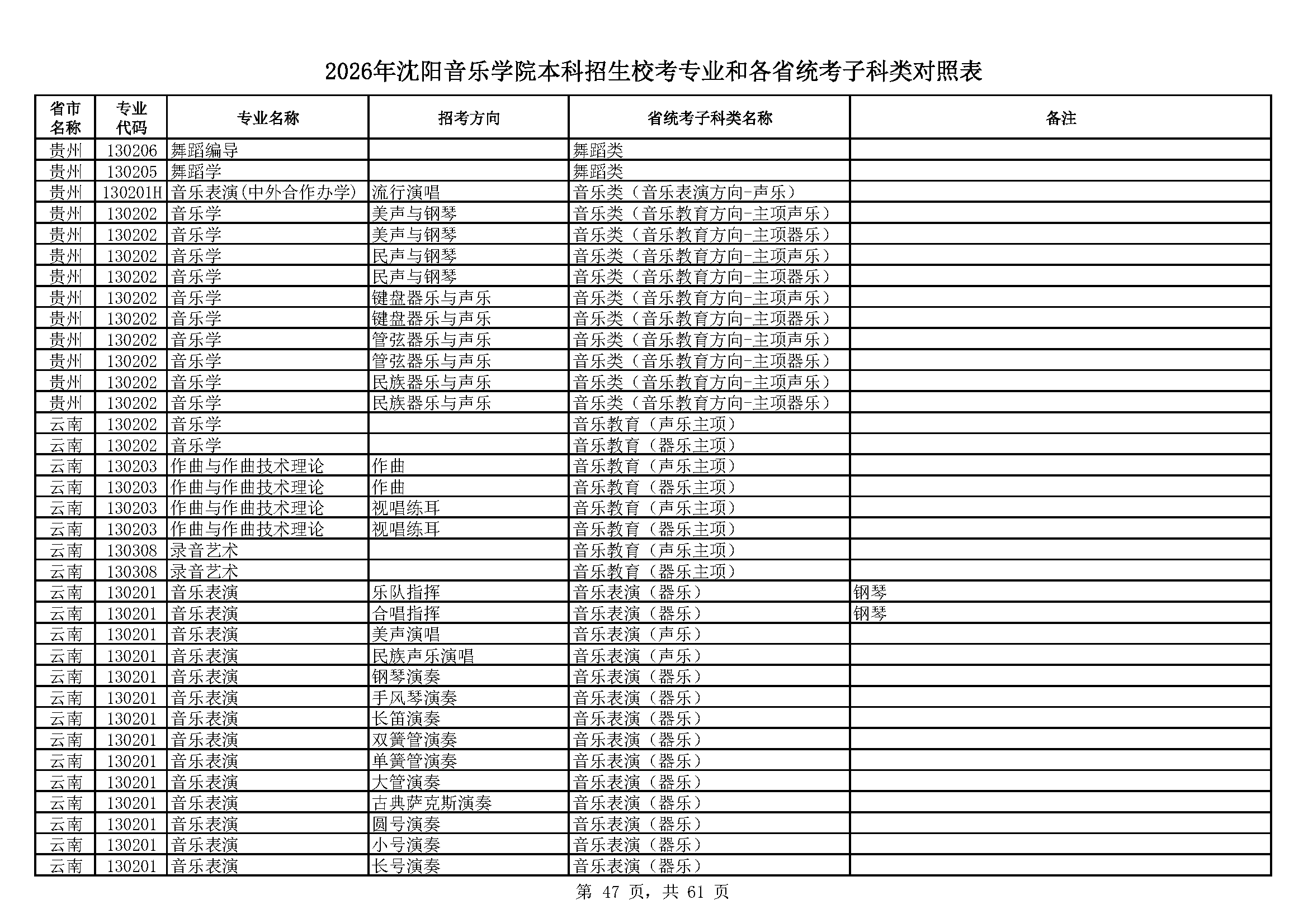 2026年沈阳音乐学院本科招生校考专业和各省统考子科类对照表(西南地区)