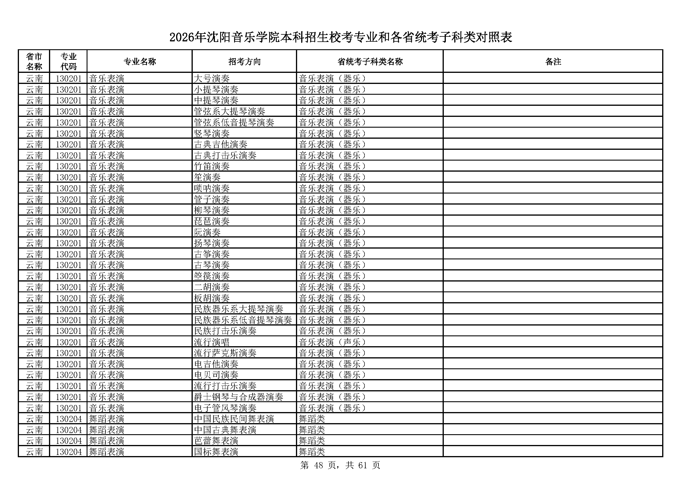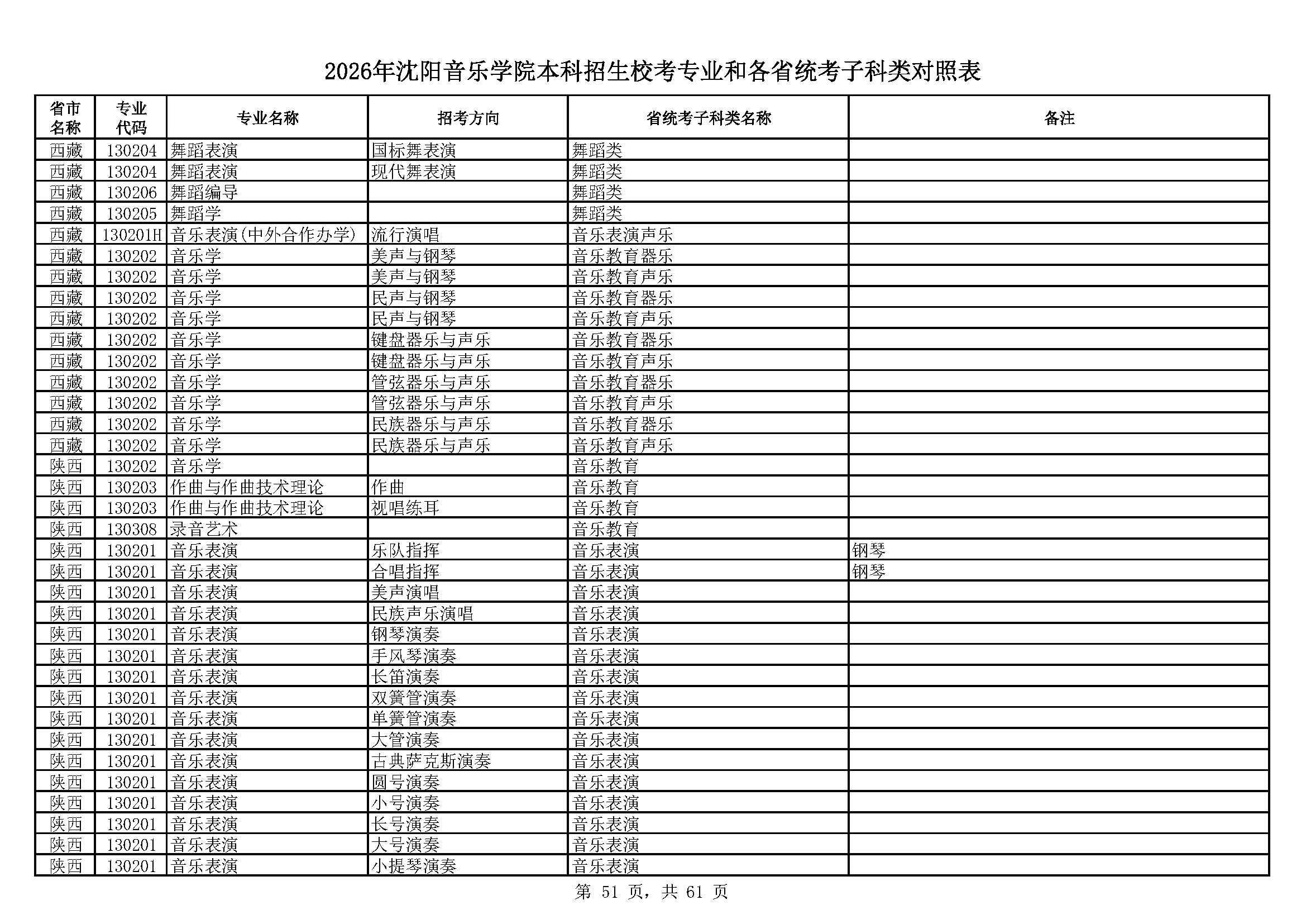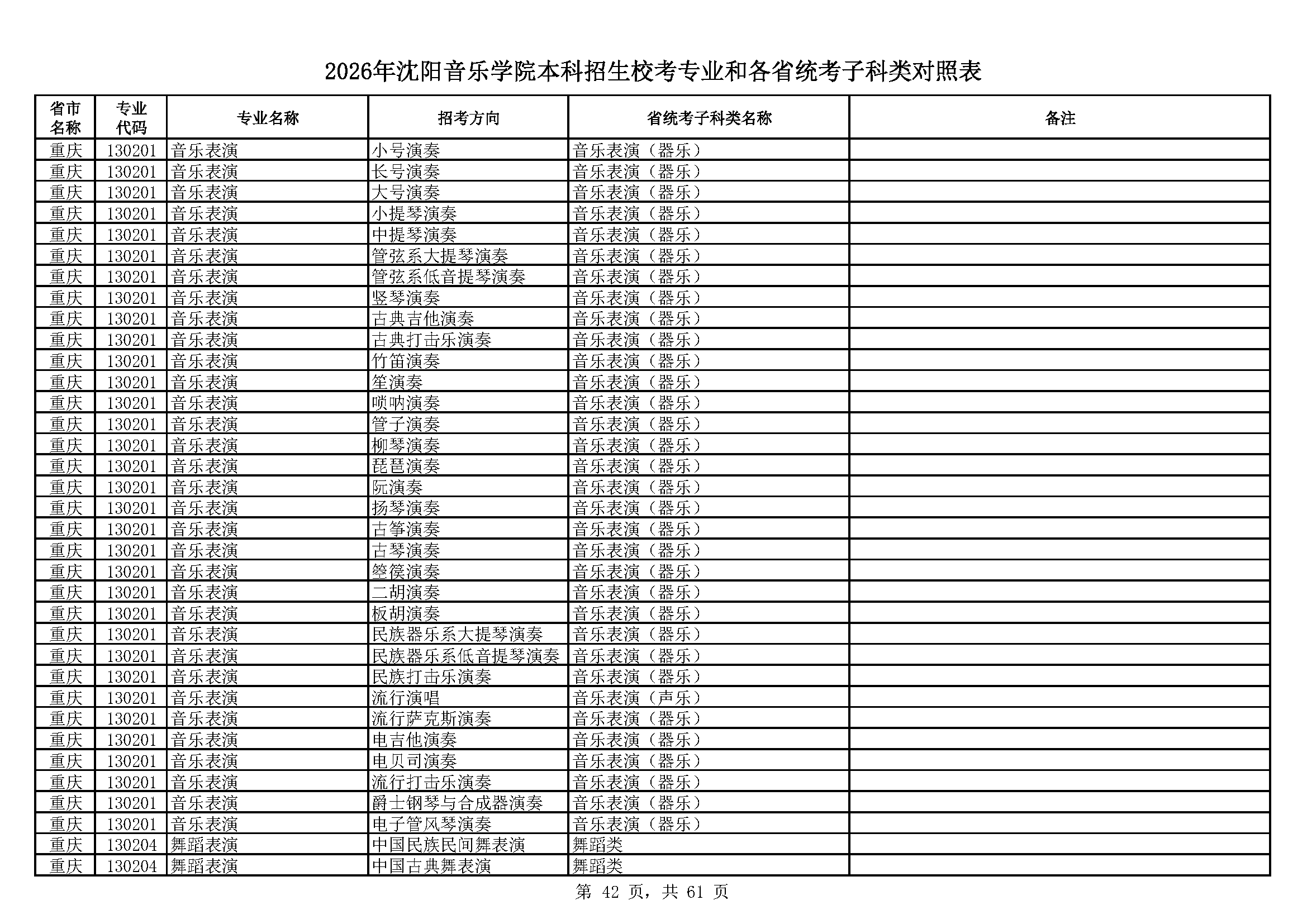 2026年沈阳音乐学院本科招生校考专业和各省统考子科类对照表(西南地区)