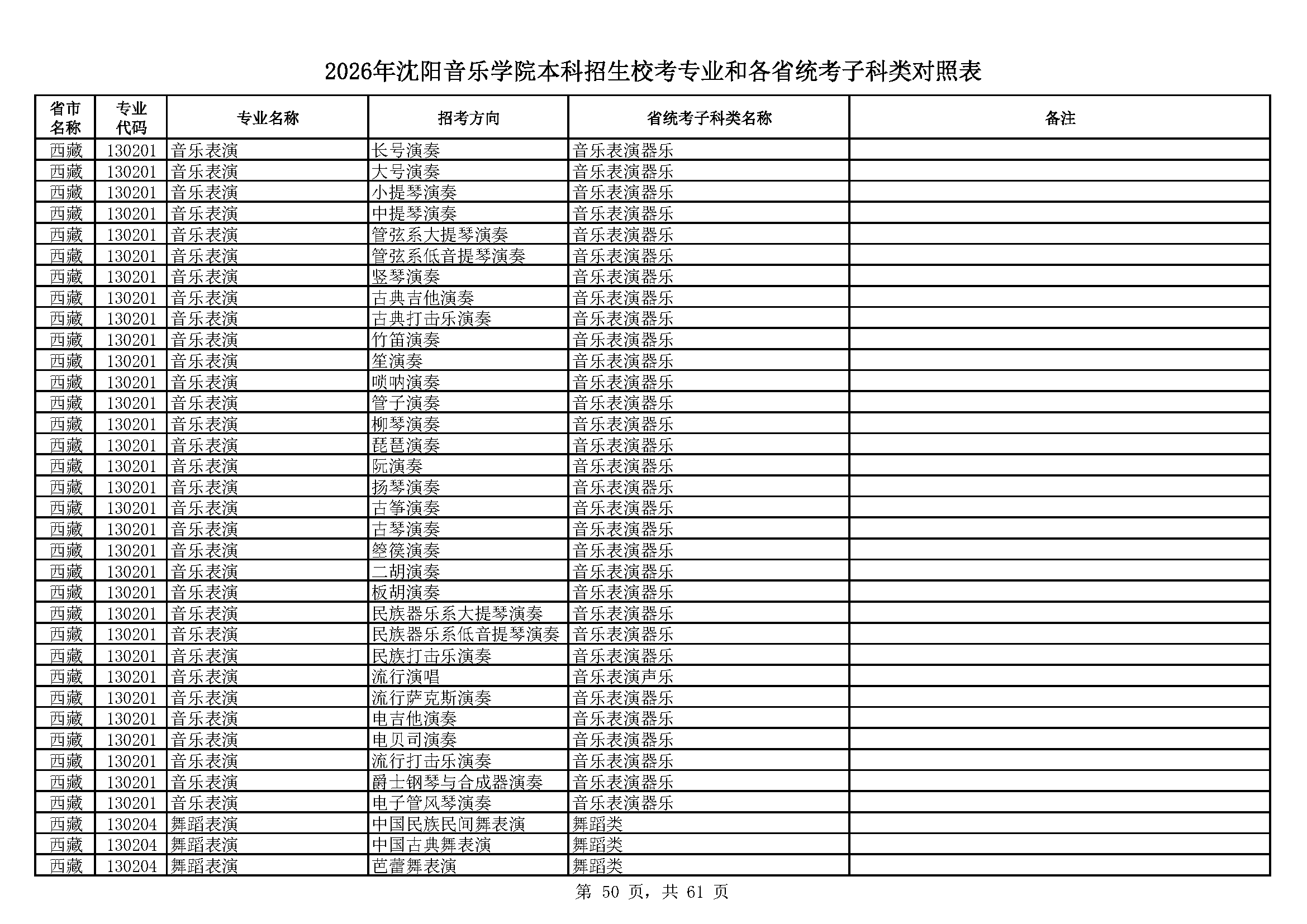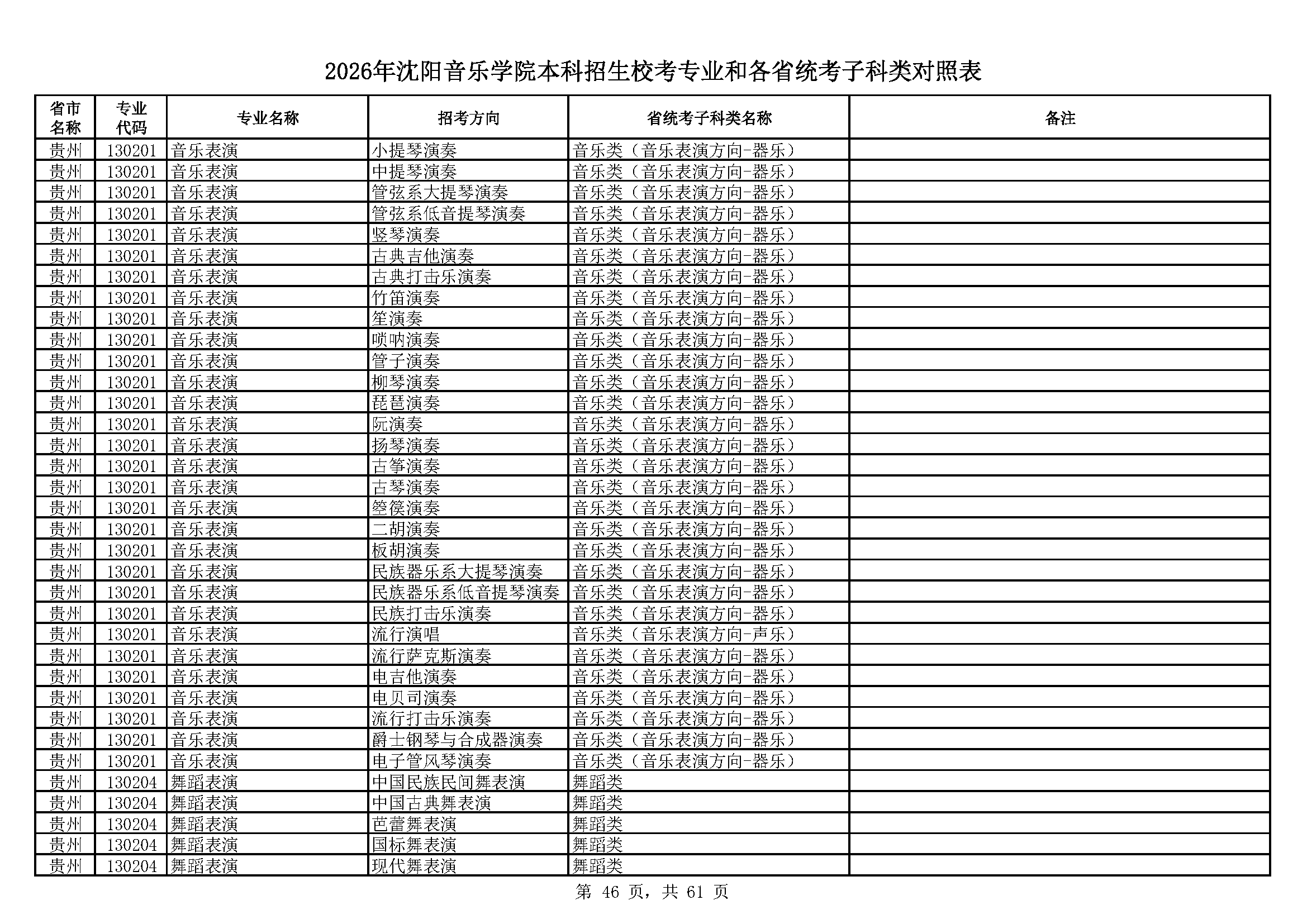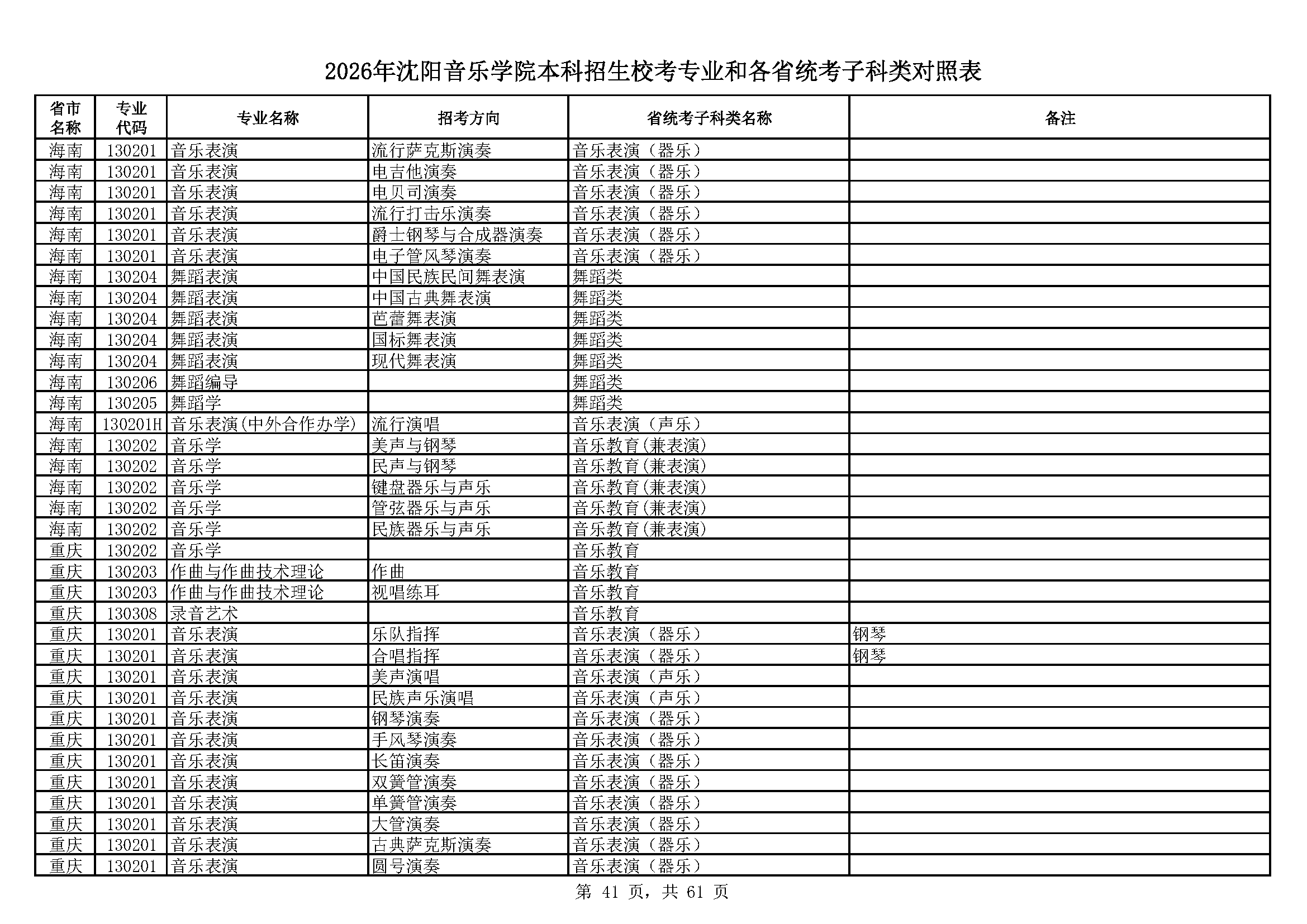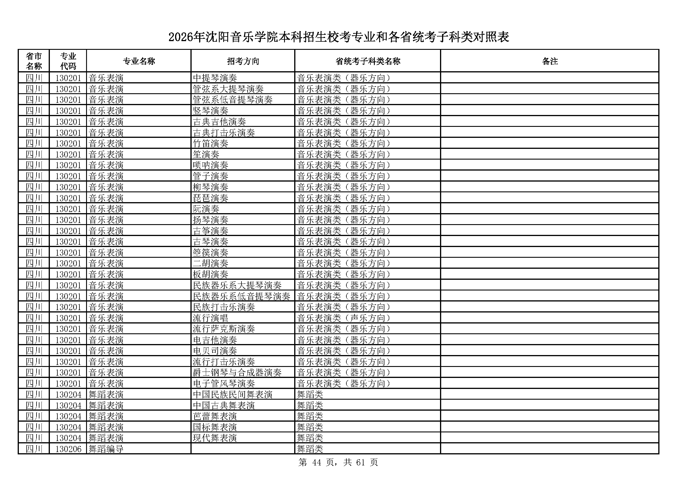 2026年沈阳音乐学院本科招生校考专业和各省统考子科类对照表(西南地区)