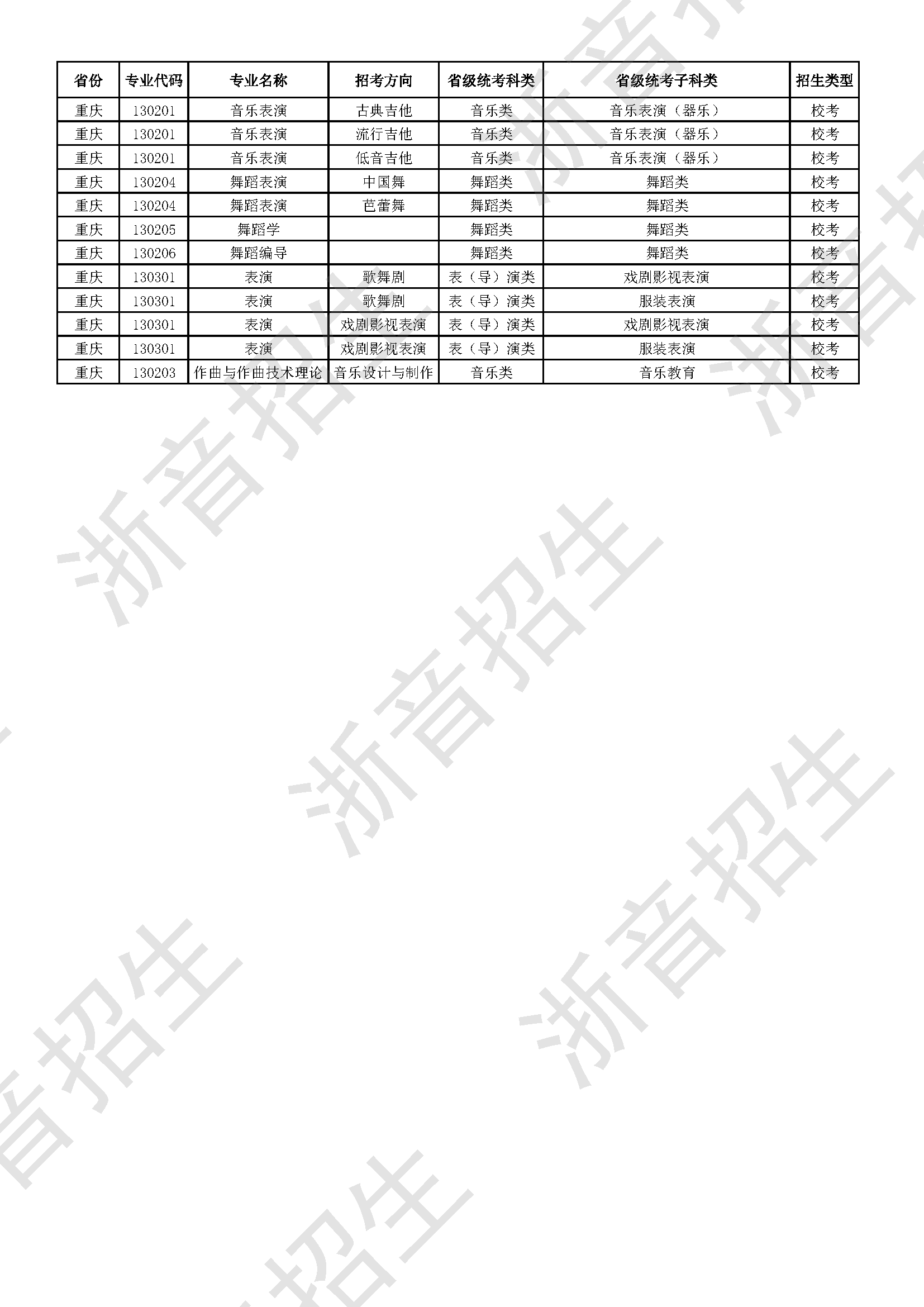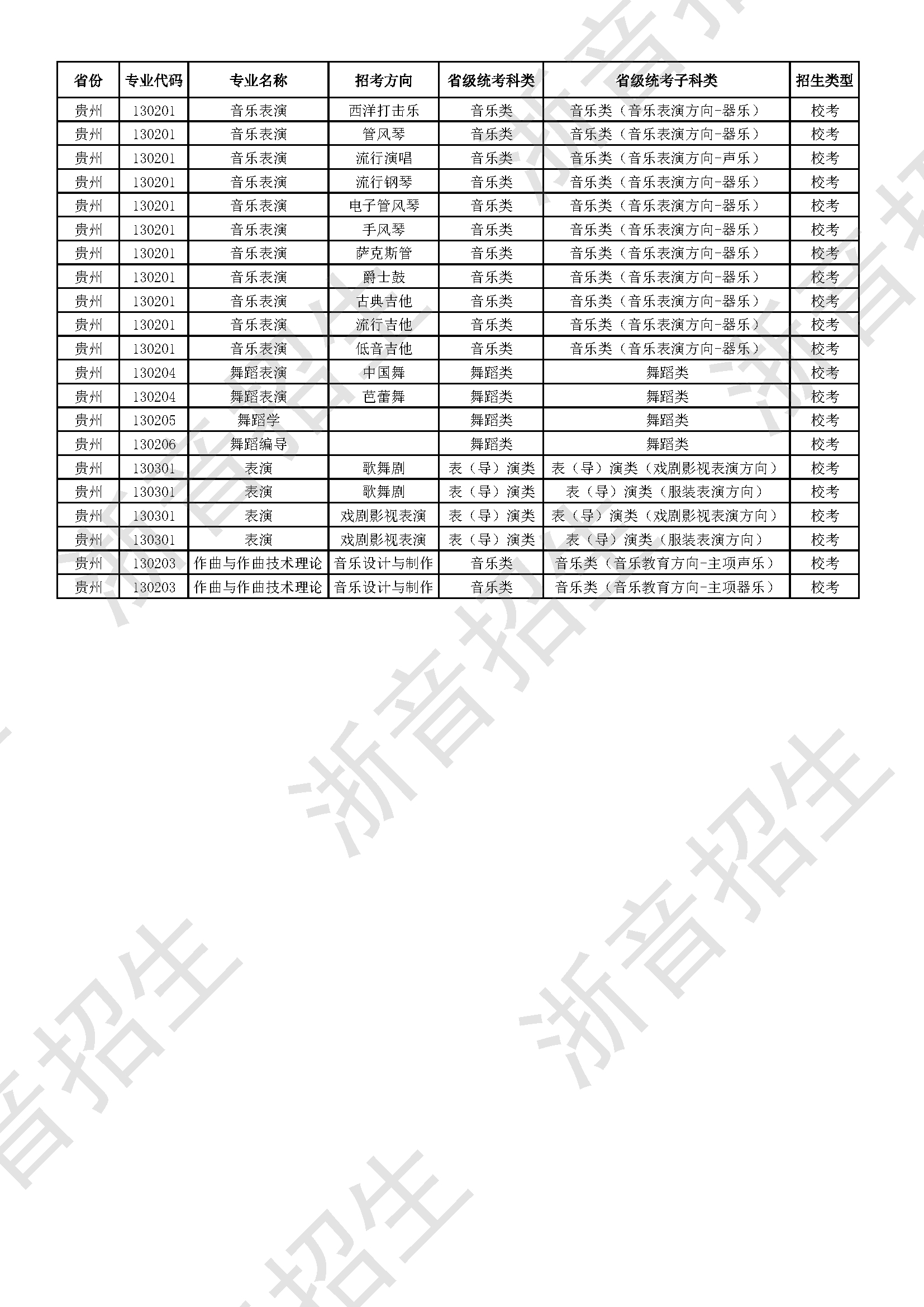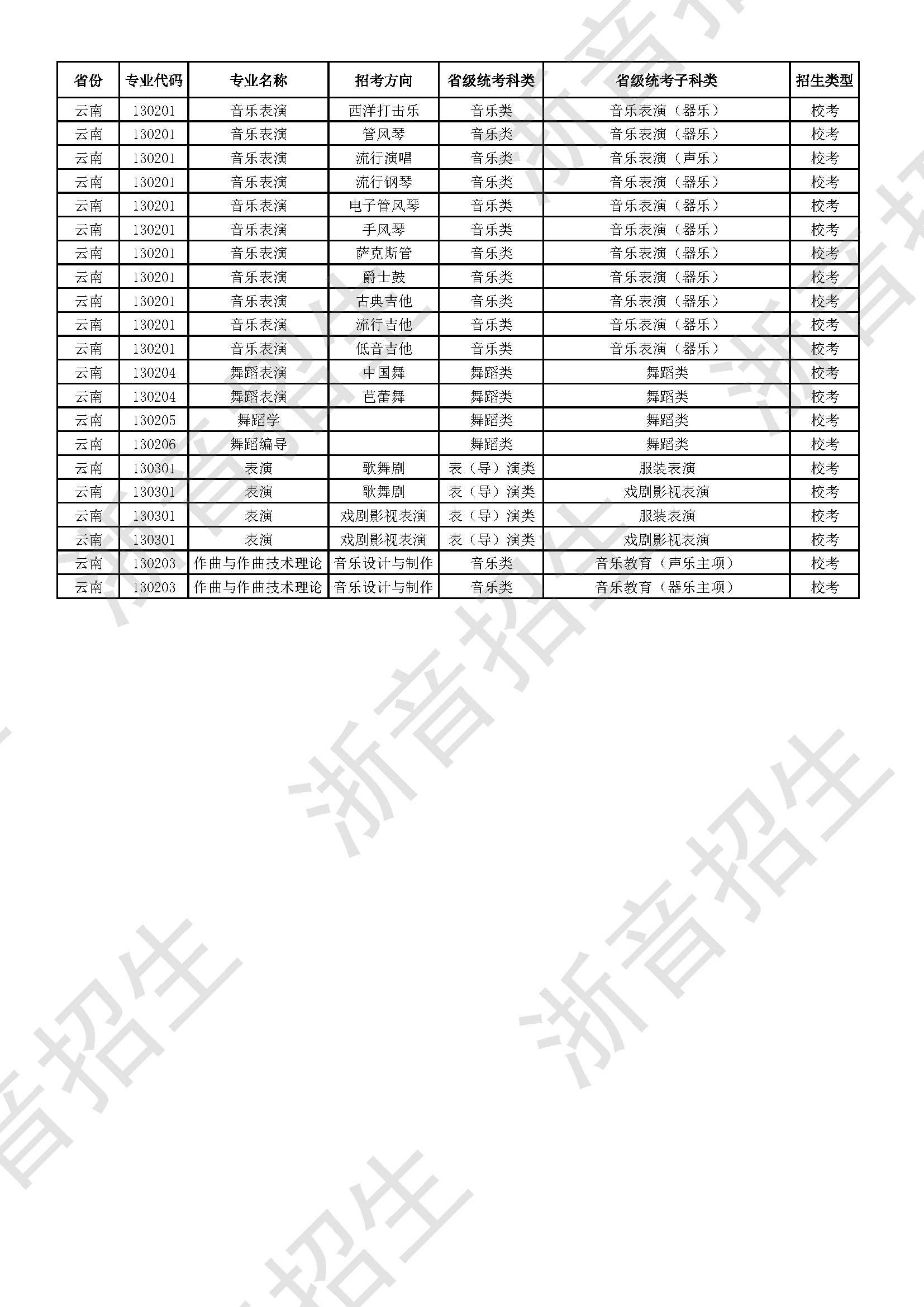 浙江音乐学院2026年本科艺术类招生专业与各省统考子科类对照表