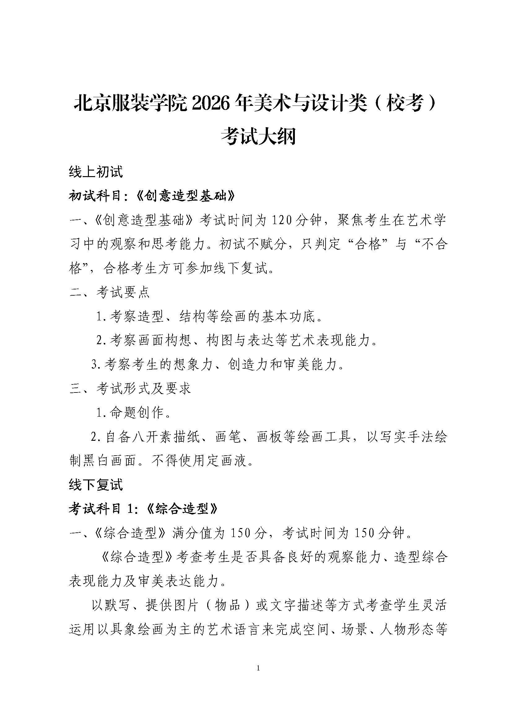 北京服装学院2026年美术类校考考试大纲