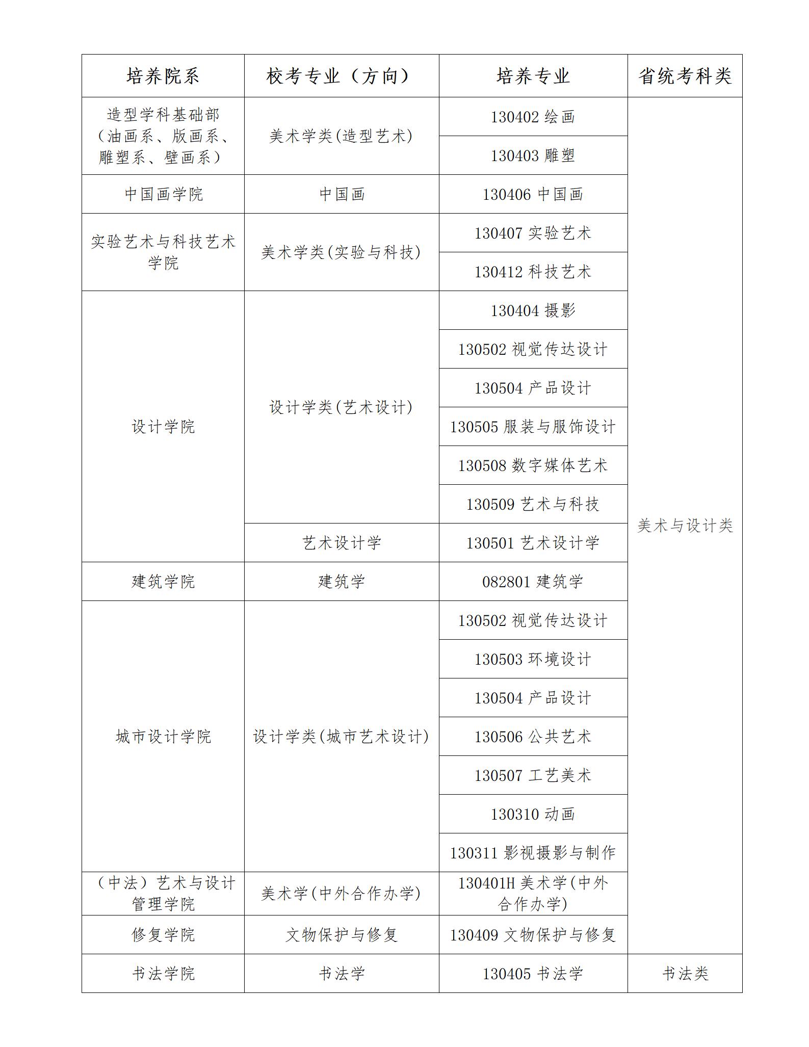 中央美术学院2026年本科招生校考专业(方向)省统考科类对应要求