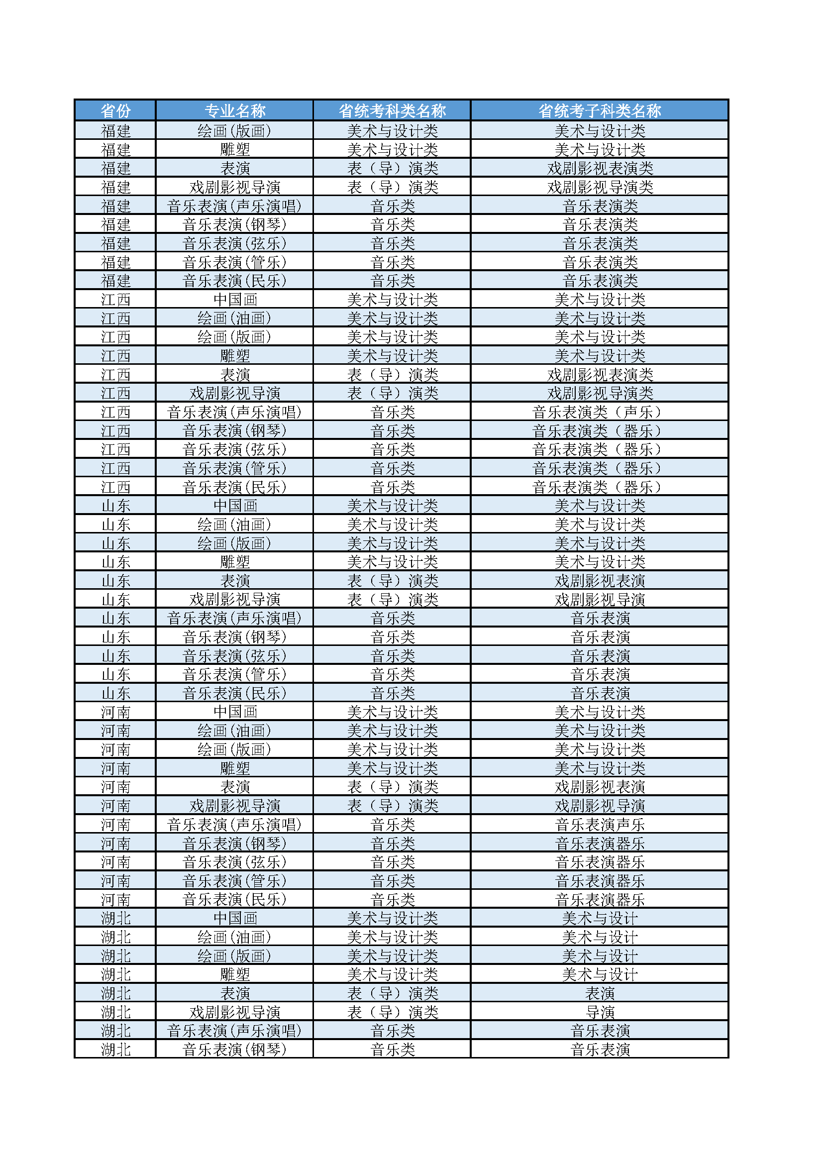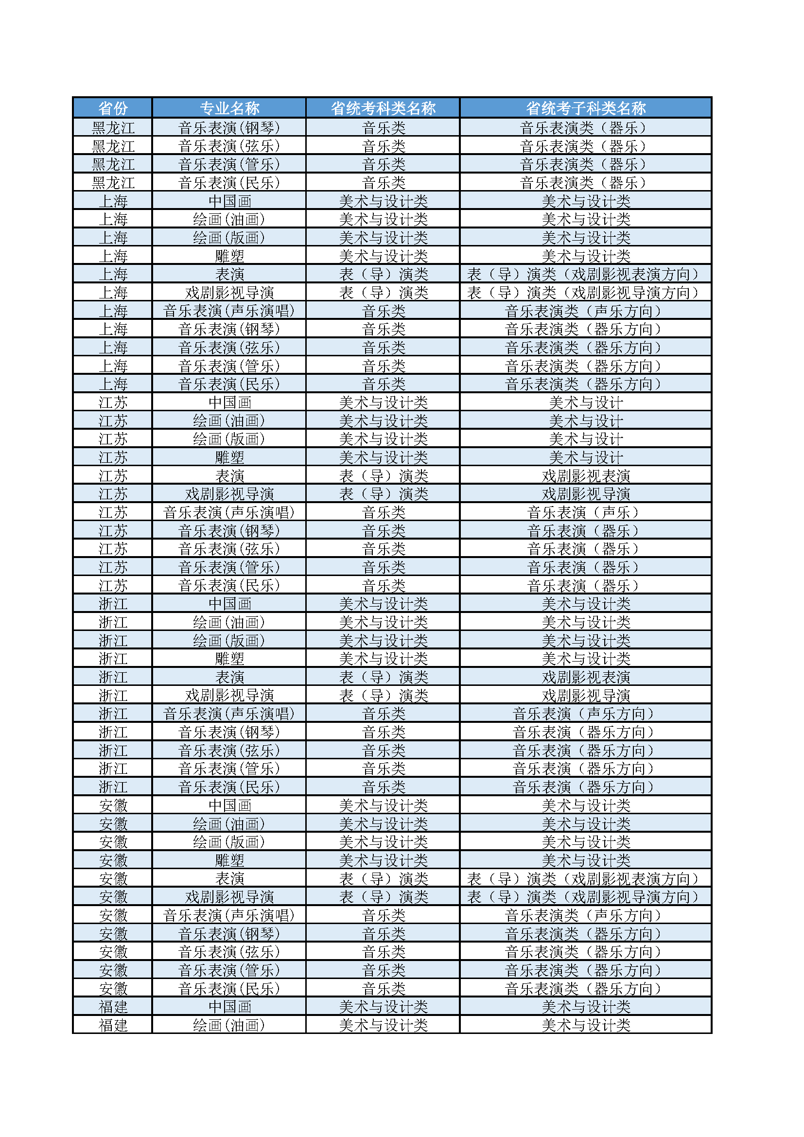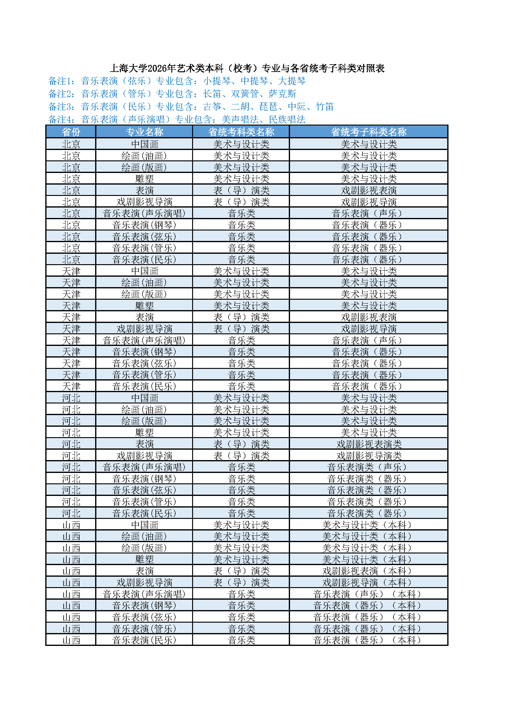 上海大学2026年艺术类本科(校考)专业与各省统考子科类对照表