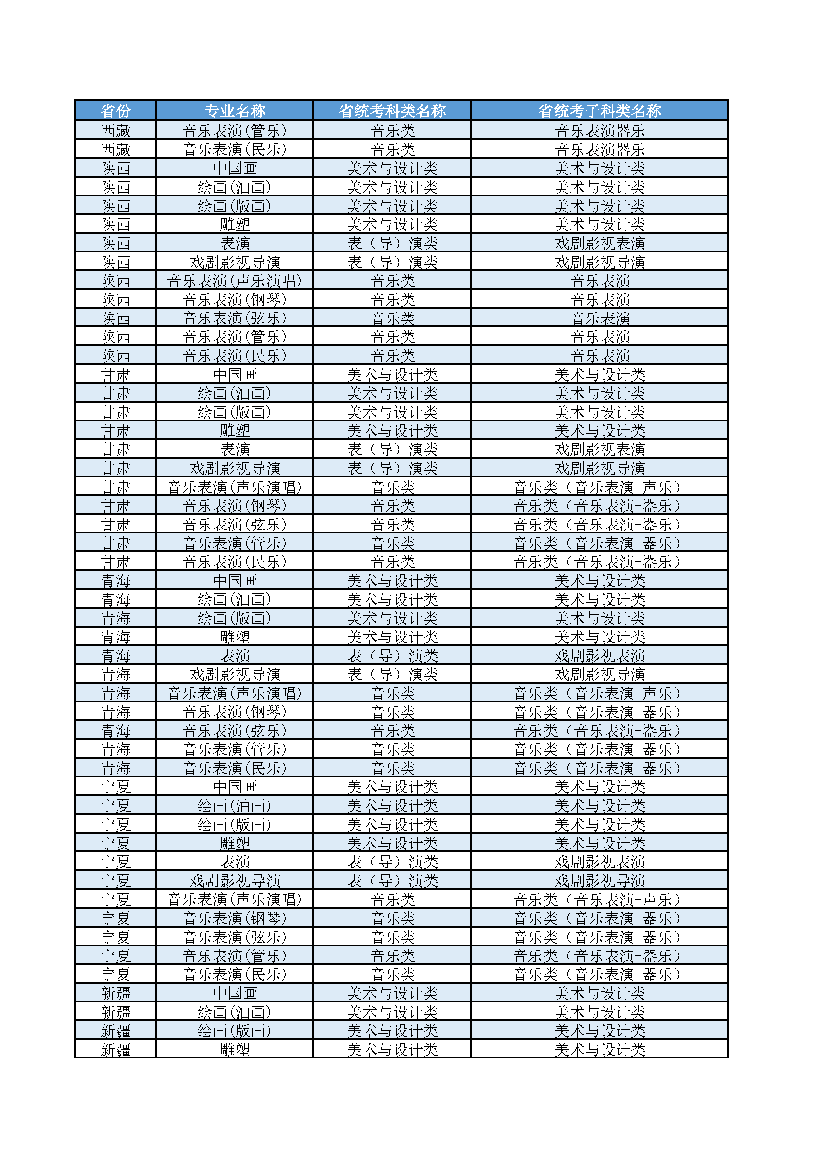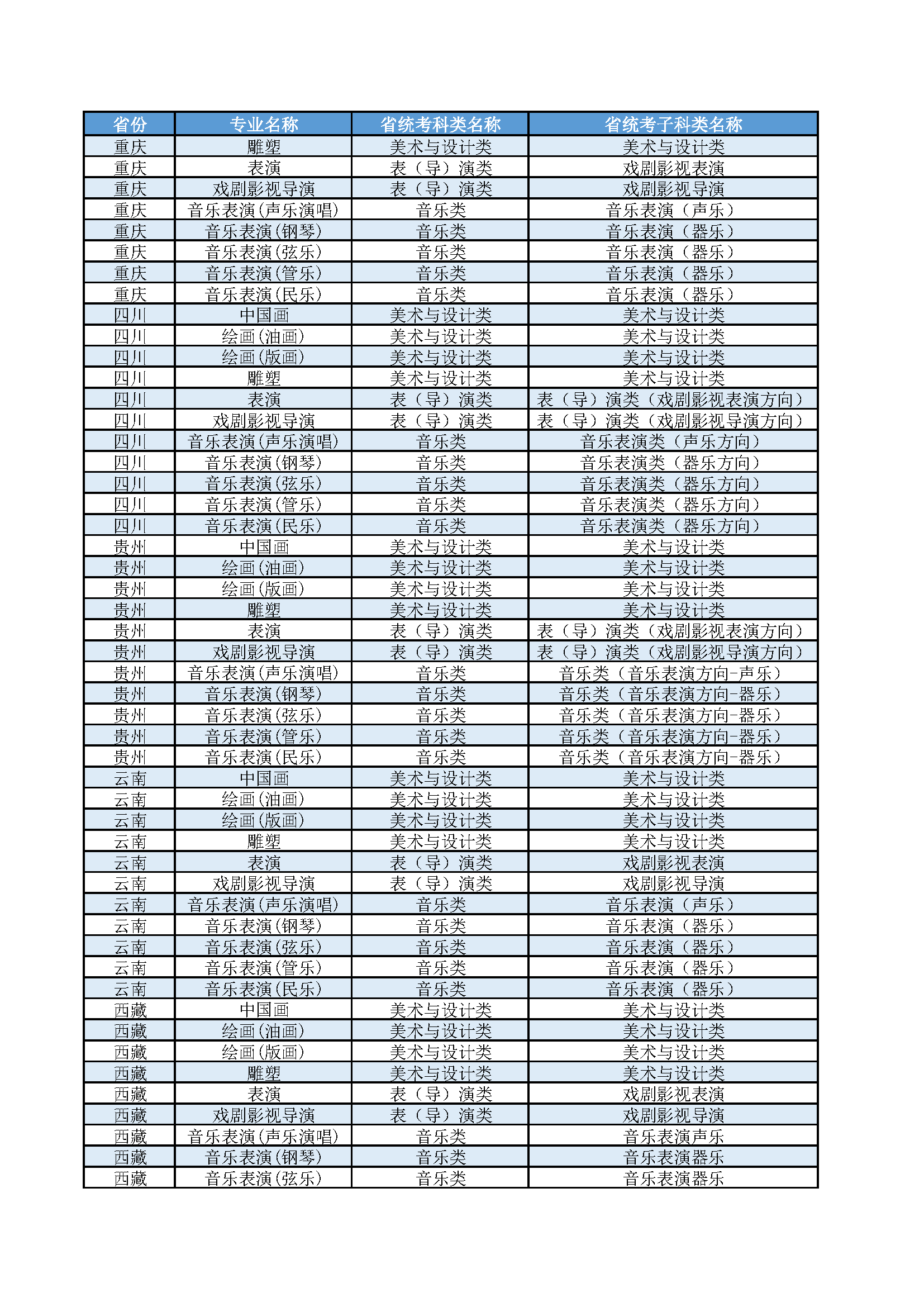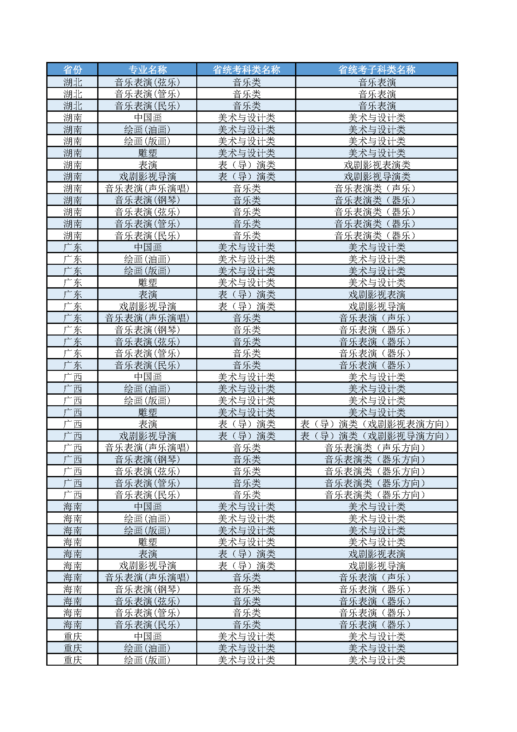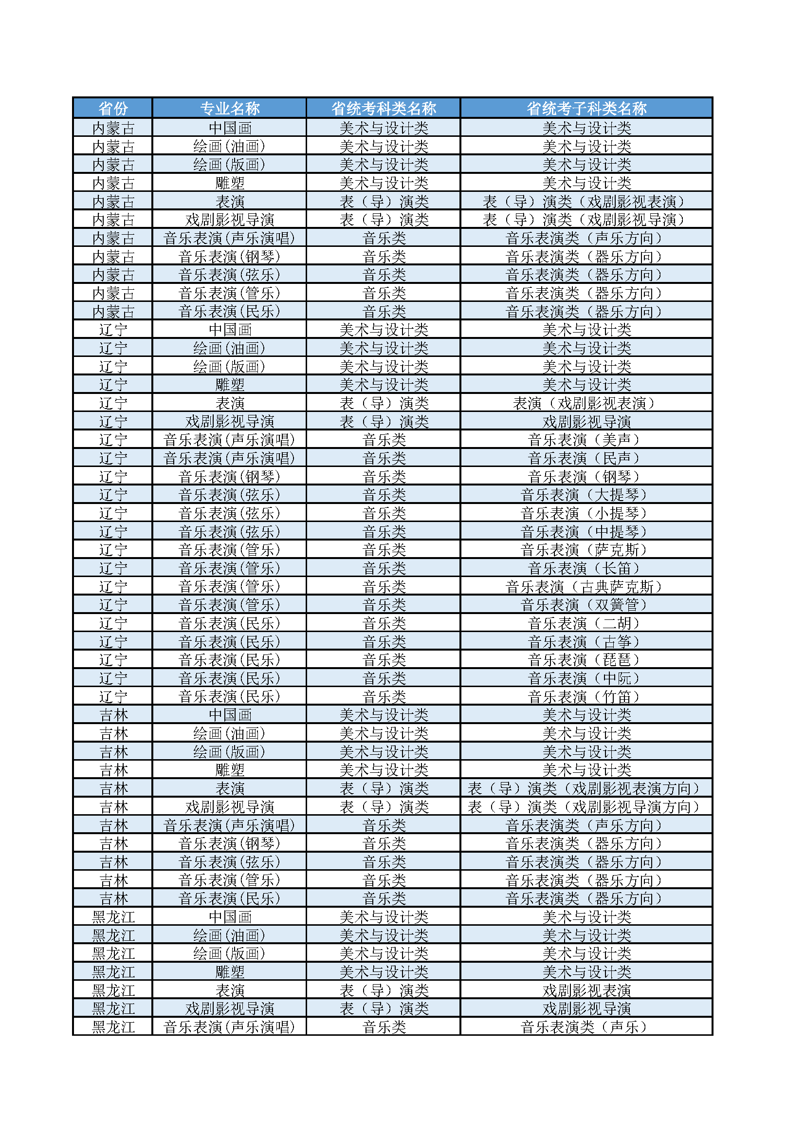 上海大学2026年艺术类本科(校考)专业与各省统考子科类对照表