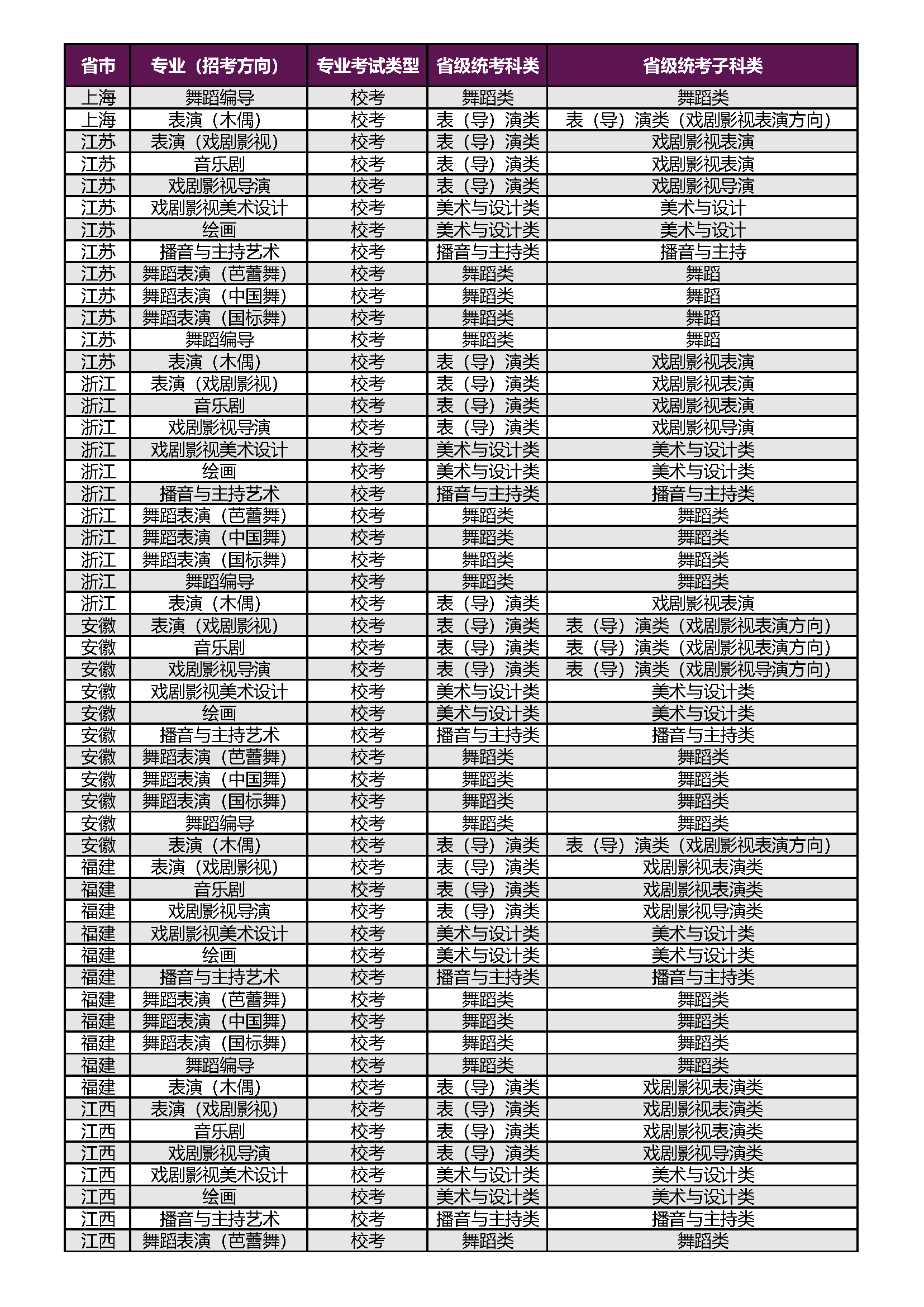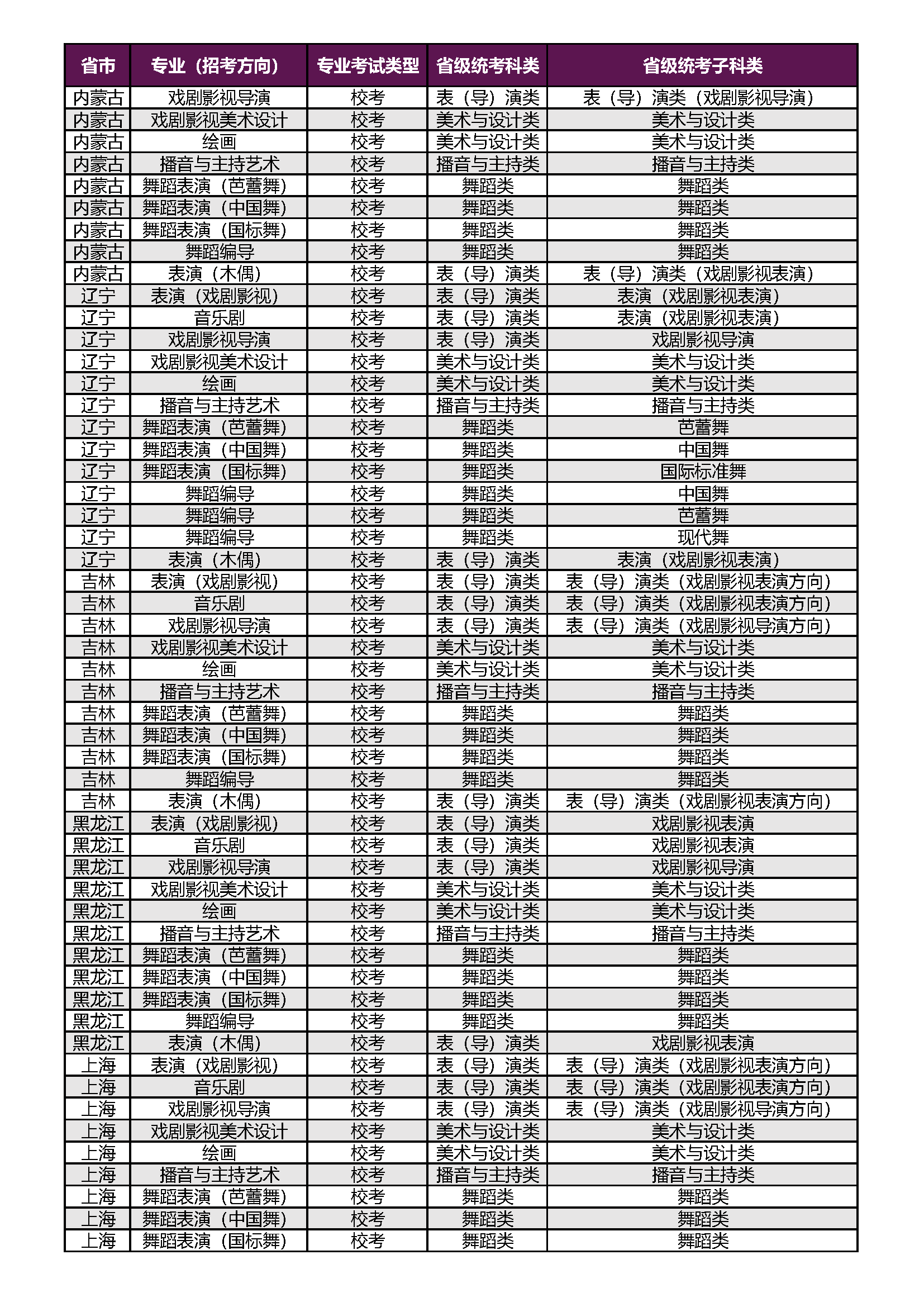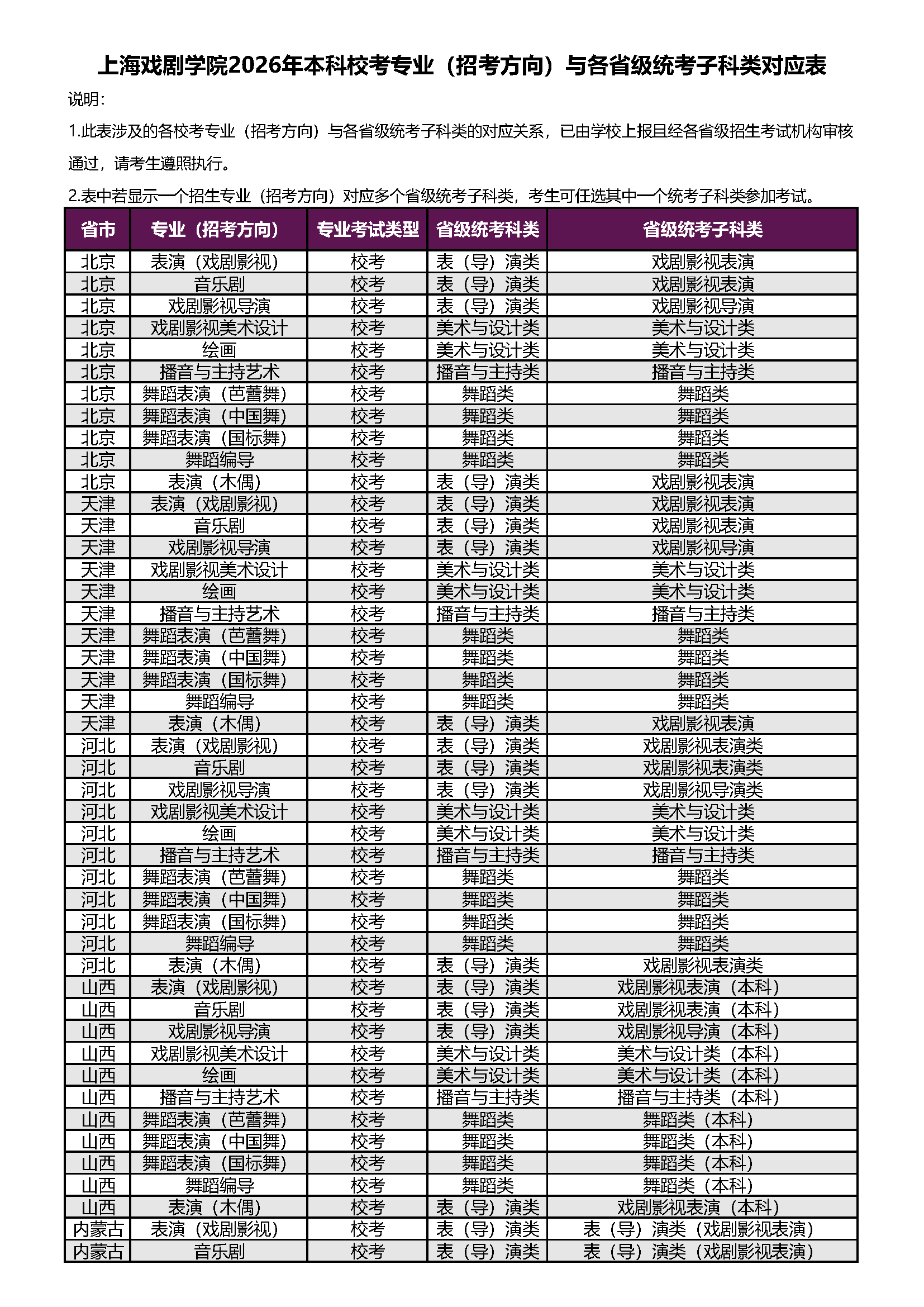 上海戏剧学院2026年本科校考专业(招考方向)与各省级统考子科类对应表