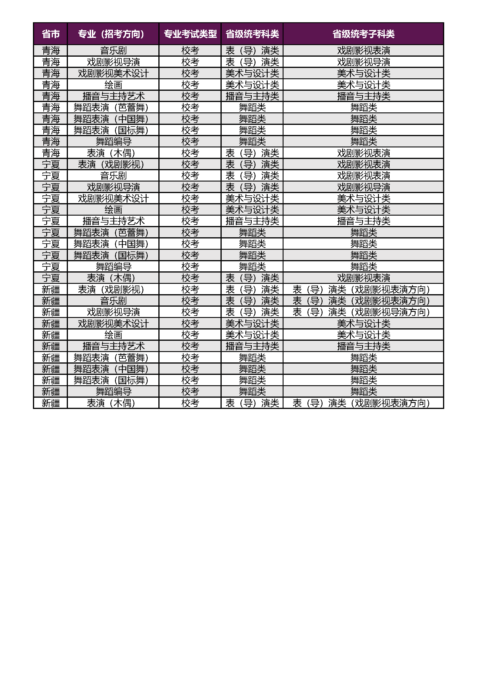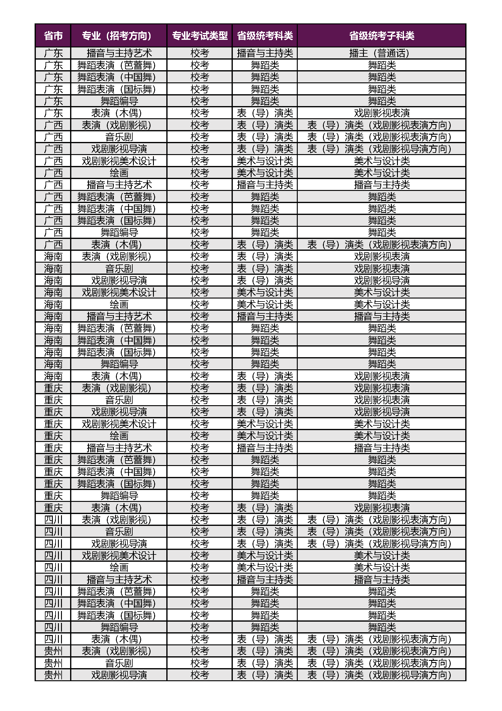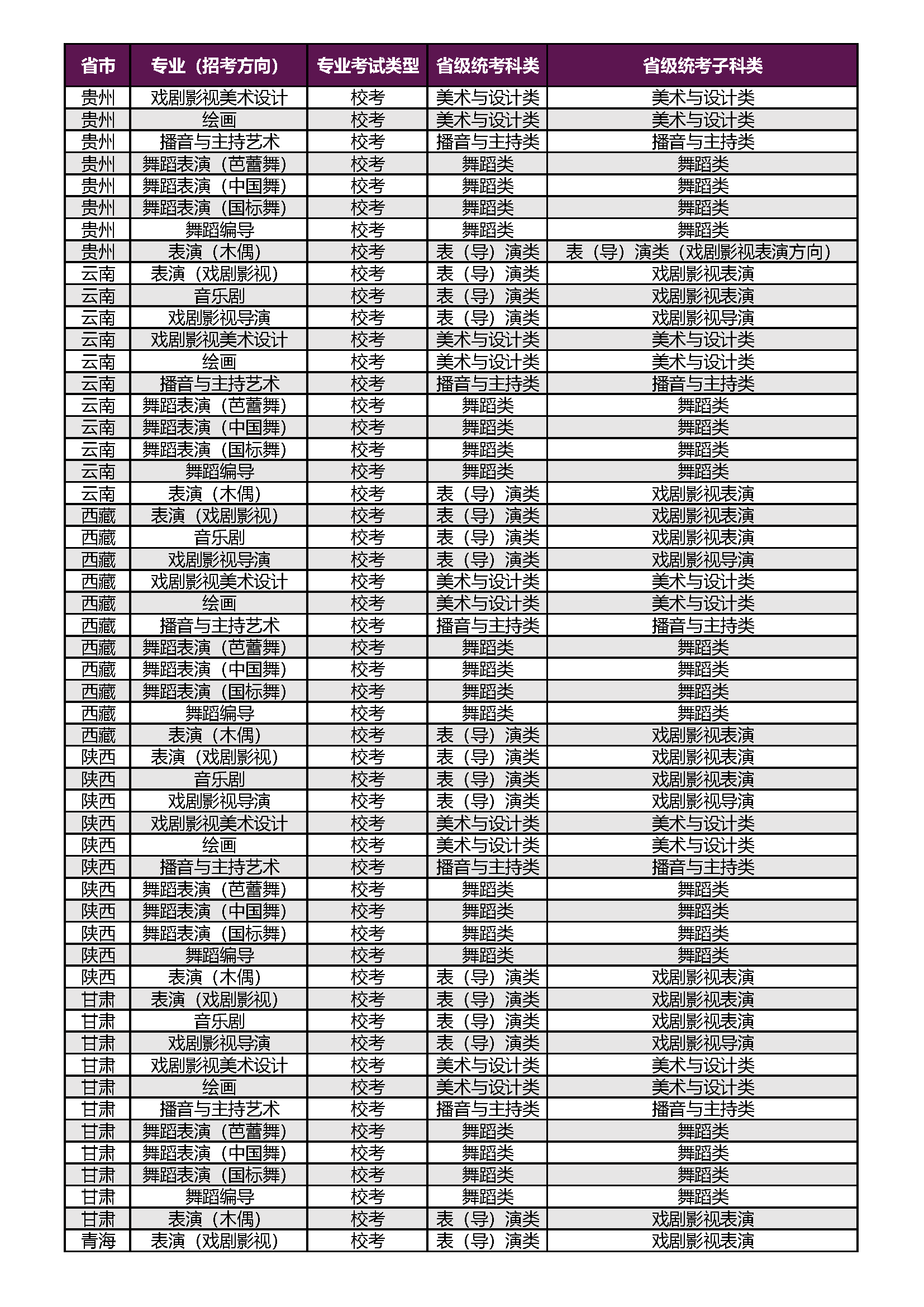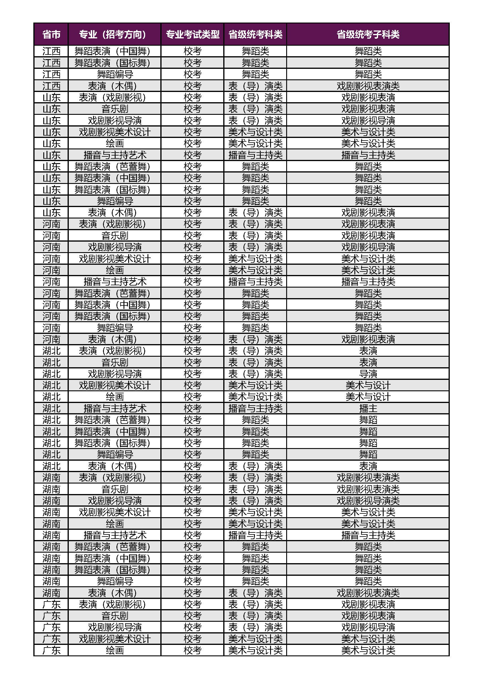 上海戏剧学院2026年本科校考专业(招考方向)与各省级统考子科类对应表