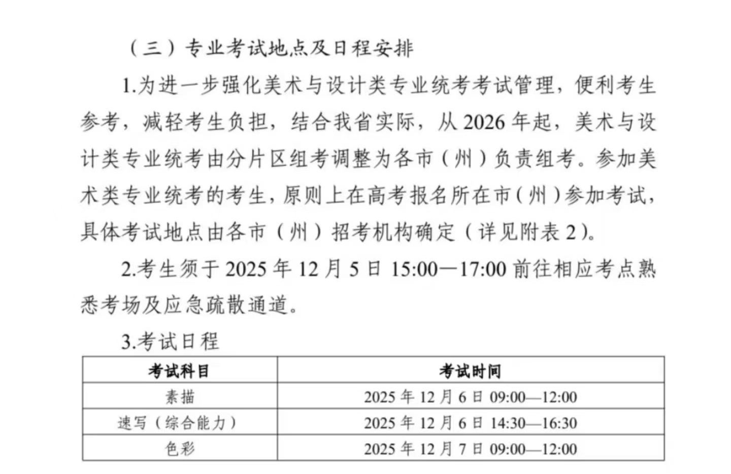 四川2026美术与设计类统考时间与考点安排来了,统考时间为12月6-7日,考点则太分散了,不过也好,大家都回自己所在地市考试,离家近了。