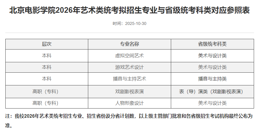 北京电影学院2026年艺术类统考拟招生专业与省级统考科类对应参照表