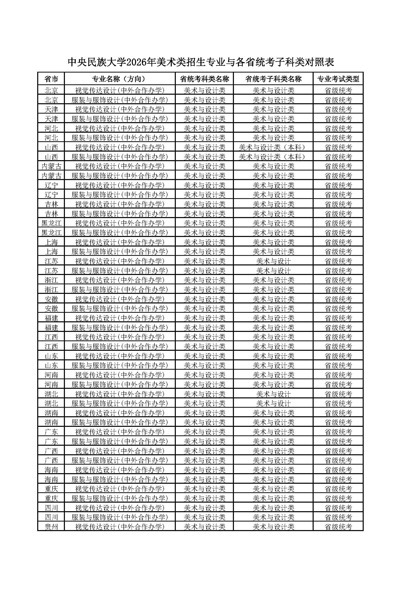 中央民族大学2026年美术类本科招生统考专业与各省统考子科类对照表
