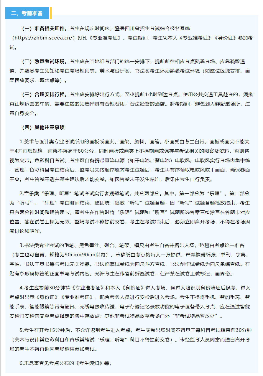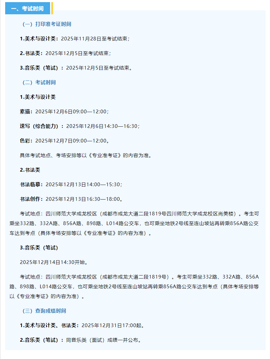 四川省2026年美术与设计类专业统考安排来了,想必所有四川美术生都已经打印好了自己的准考证(28号就可以开始打印了),没有打印的美术生抓紧时间,同时也尽量多打印几张备用。第一天考素描与速写,第二天则只考色彩一科,最让大家关心的时间是考试成绩公布,今年四川非常贴心,美术联考成绩在12月31日下午5点即可查询了,祝各位考生联考大捷,好运连连!
