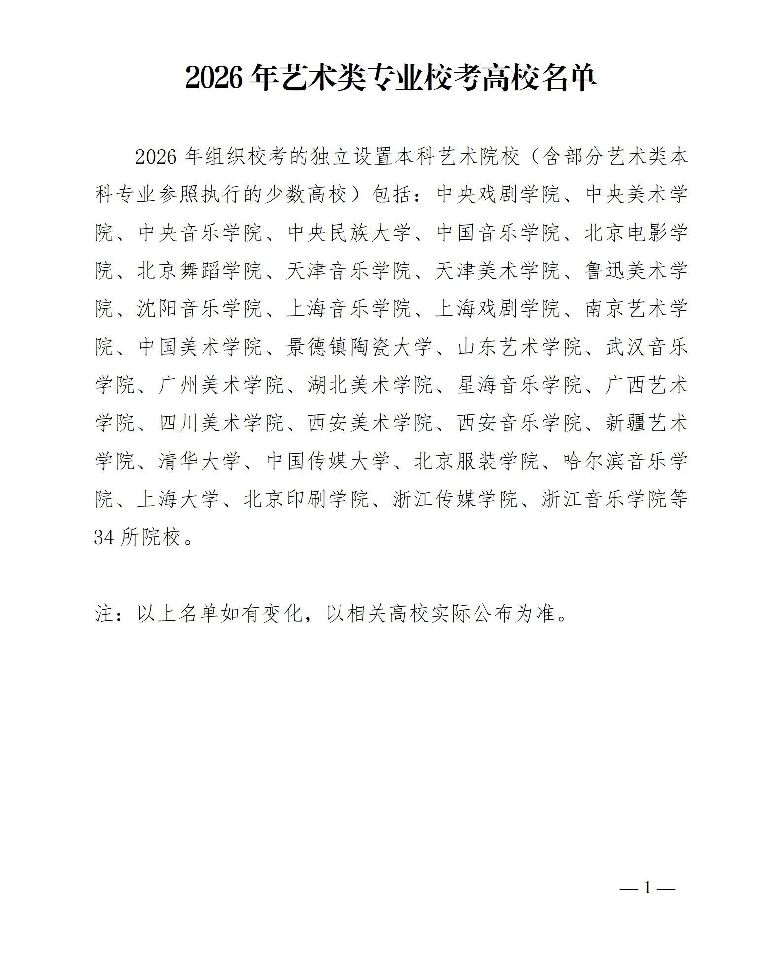 2026艺术类校考院校名单