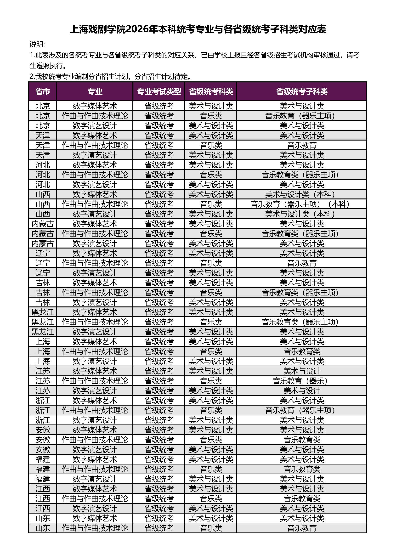 上海戏剧学院2026年本科统考专业与各省级统考子科类对应表