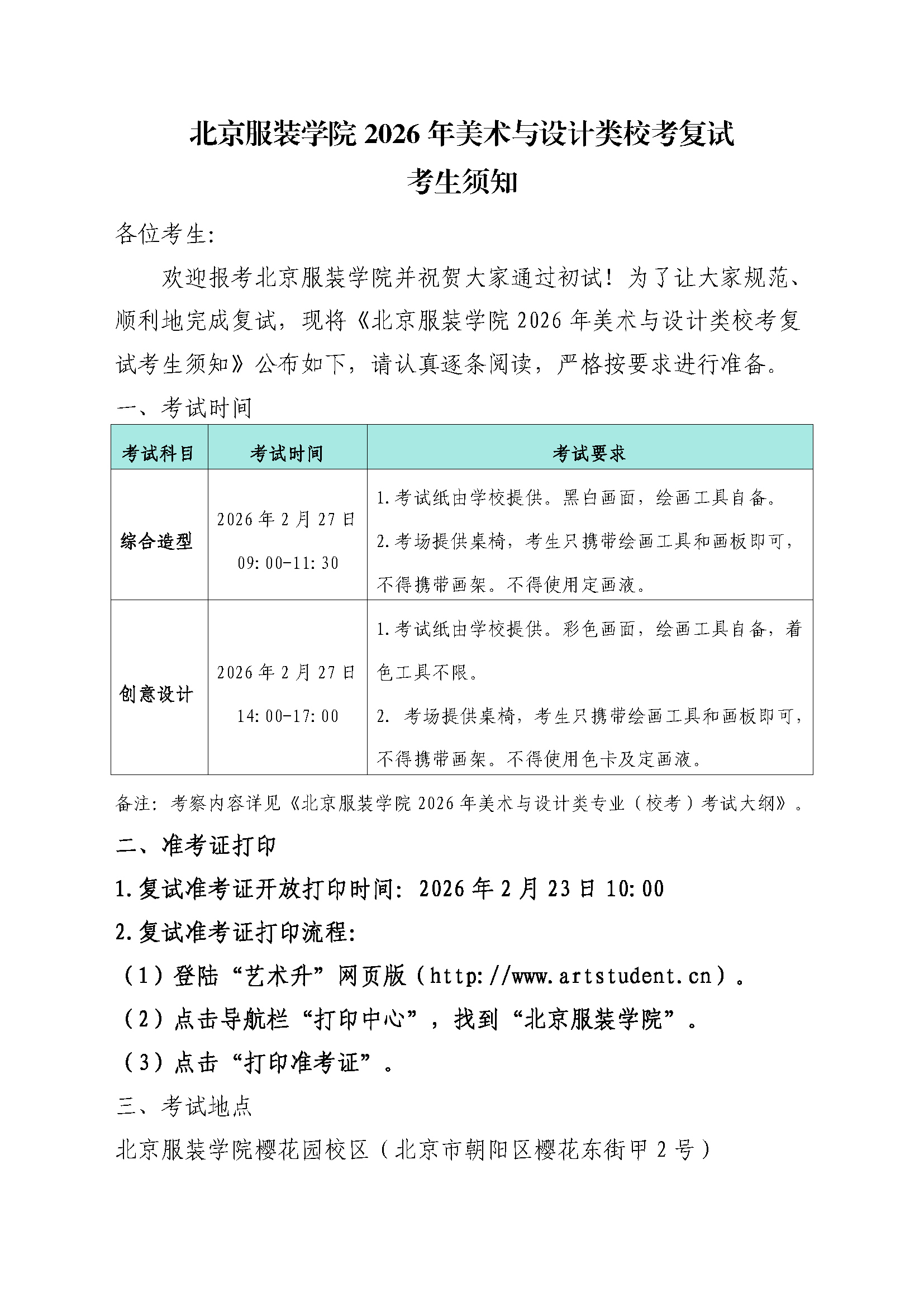 北服2026美术与设计类校考复试须知